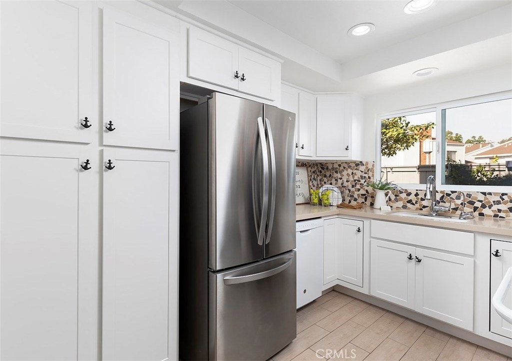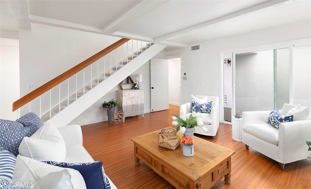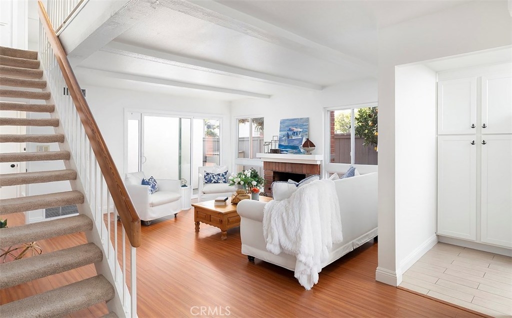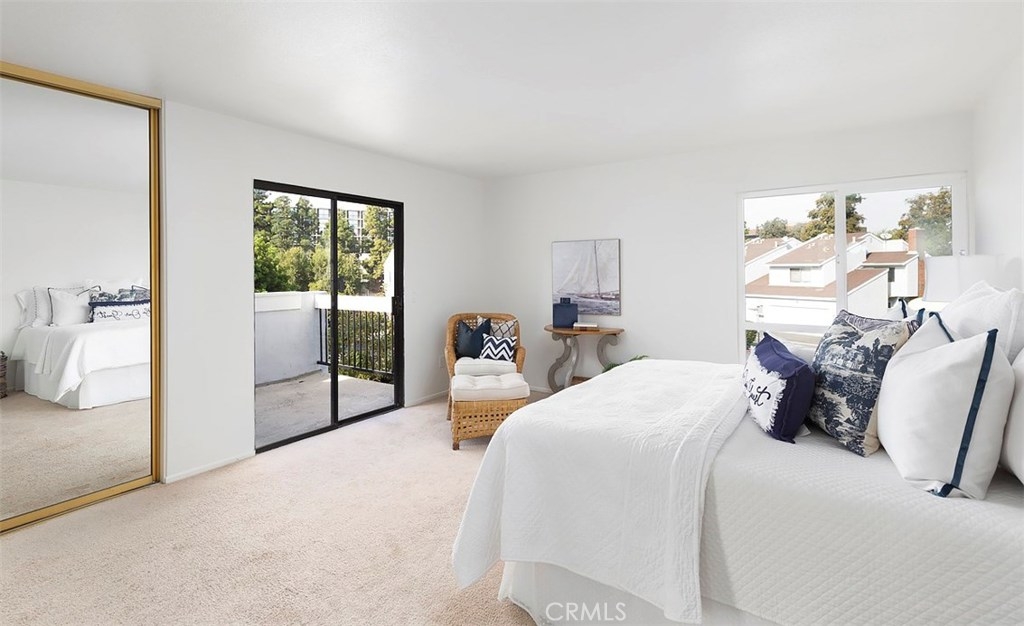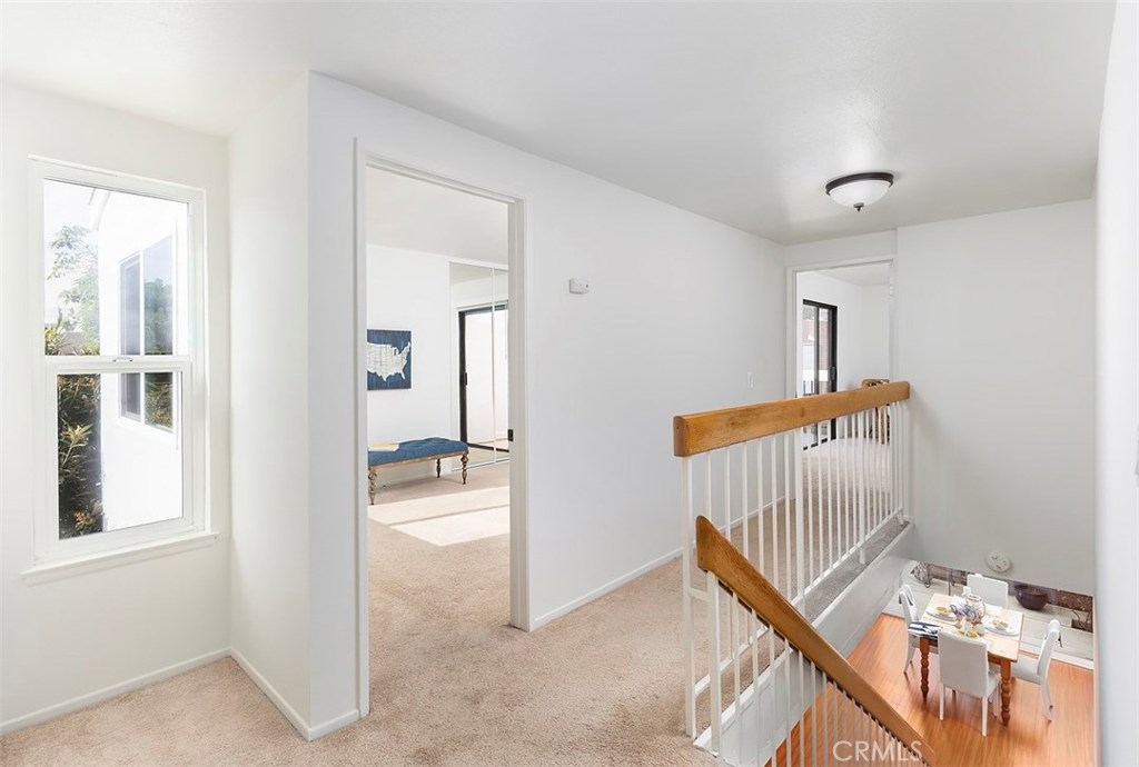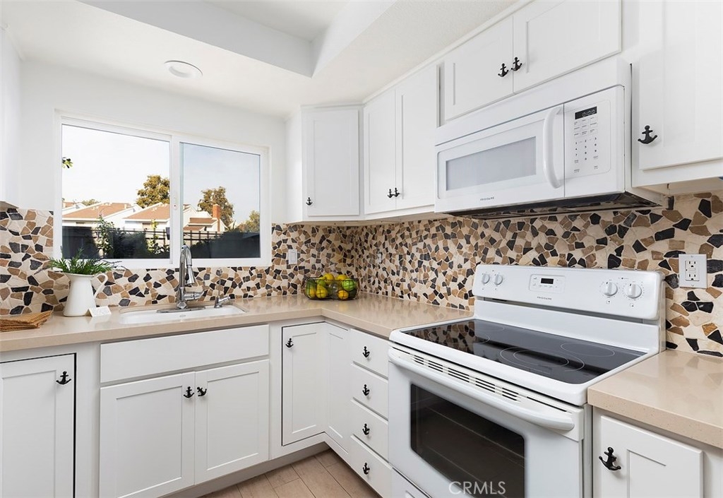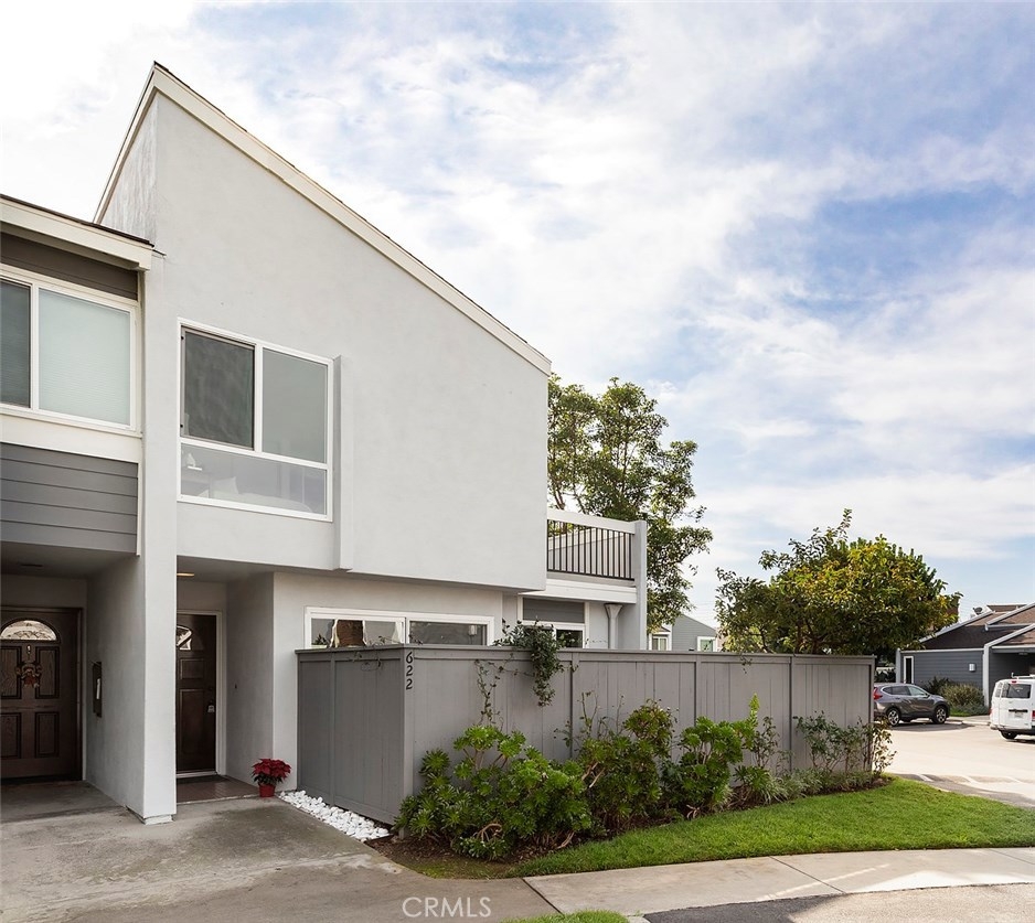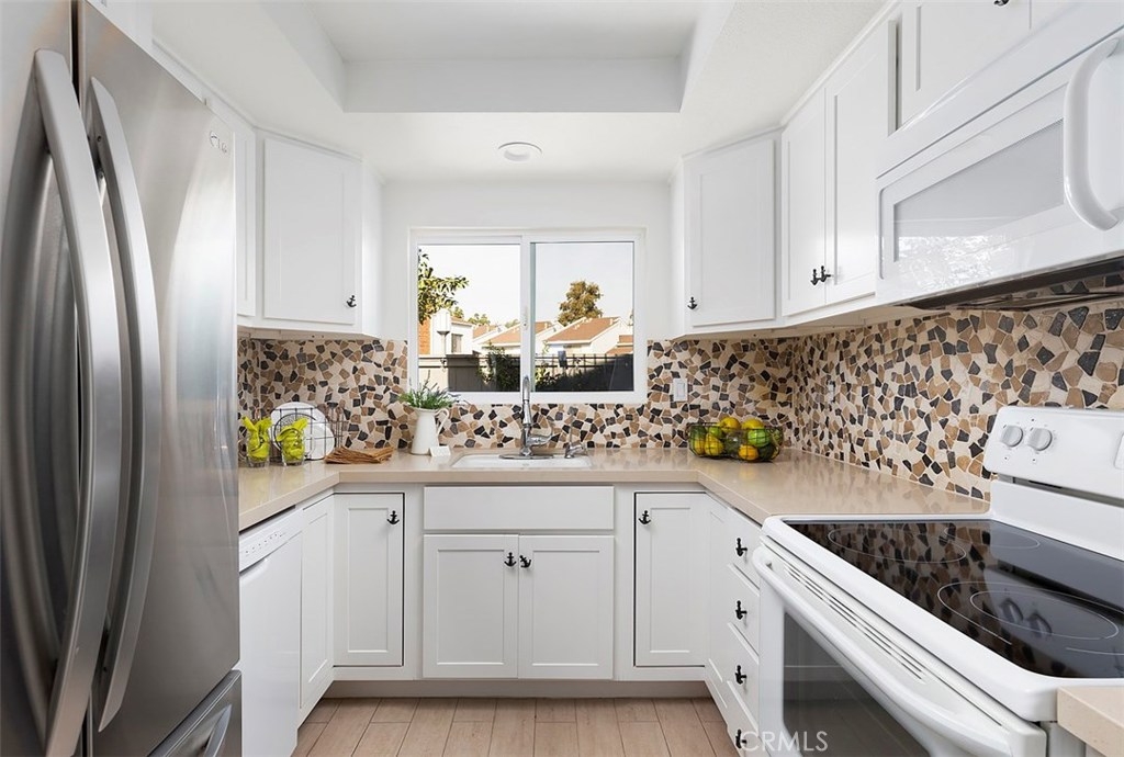 Across from the clubhouse and sparkling pool in Brookview Condominiums, this charming beach style end unit condo is freshly painted, light and bright, with a floating staircase and walls of windows and sliders offering views of the charming patio. It feels open and welcoming throughout. Living room with brick fireplace, walls of windows and light, and wood style flooring. Dining room is open to the living room and features wood style flooring and a view of greenery on the inviting patio. Updated Kitchen is white and bright with quartz counters and newer cabinets, and appliances. A floating staircase leads to 3 spacious bedrooms with large mirrored closets, an inviting deck – open to multiple bedrooms and with views over the complex. 3 bathrooms and a separate laundry room. Newer heating and AC. The patio is a lovely place to relax with sliders from the living room and dining room and is complete with fruit trees! There is a 2 car attached garage. The Brookview Condominium Complex featured 2 pools, 2 tennis courts, and 2 clubhouses. It is just a couple minutes from South Coast Plaza, Segerstrom Center for the Arts, and The LAB Anti-mall all with shopping, entertainment, and amazing restaurants all around! Close to UCI and the beach!