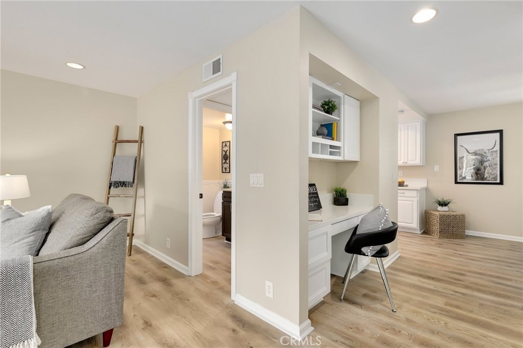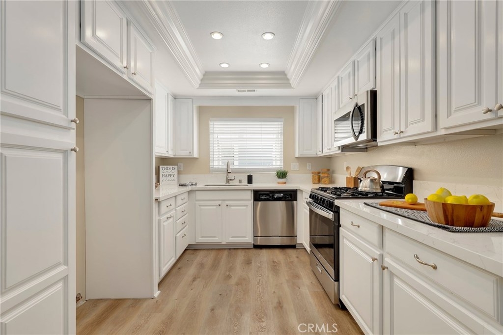 Come live your best life in this spacious tri-level floor plan in the desirable Garden Park Village with serene pool views. This is a detached, single family dwelling too! Entry level is on the second level above the attached two car garage and features a light and bright living room with a cozy fireplace accented by stacked stone and illuminated by recessed lighting. Open the balcony doors wide to let the cool breezes flow in and create an indoor outdoor living atmosphere. Two balconies provide a serene escape overlooking the pool and spa. A built-in workstation will keep you productive all year round. The dining area and kitchen flow seamlessly together for ease of daily living. The kitchen features crisp, white cabinetry, quartz countertops, stainless steel appliances and a tray ceiling with recessed lighting. The top level has three bedrooms including a primary bedroom. The Primary bathroom has dual sinks and a shower. Laundry area is also on the top floor. Direct access to the attached two car garage makes parking a breeze. Only 10 minutes to Newport Beach for endless outdoor activities and luxury shopping options. Quick freeway access will make commuting easier. To see it is to love it!