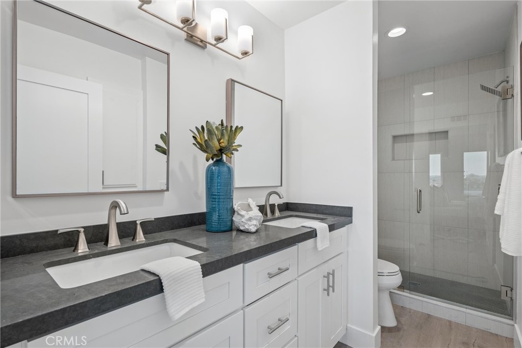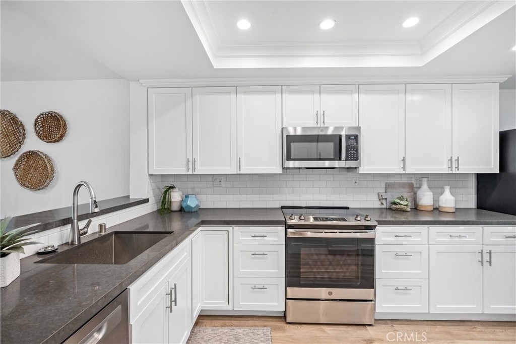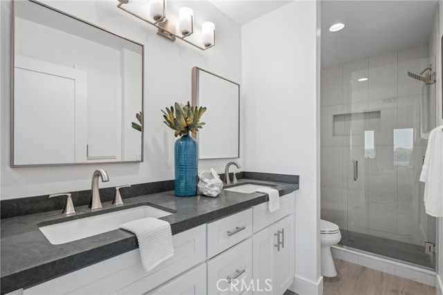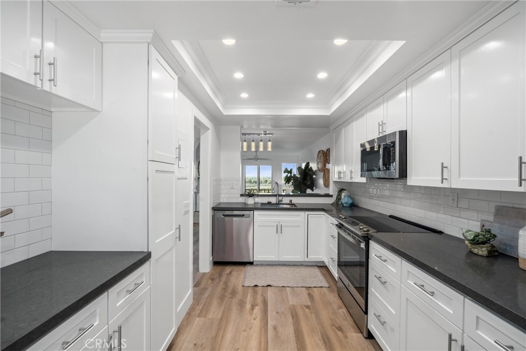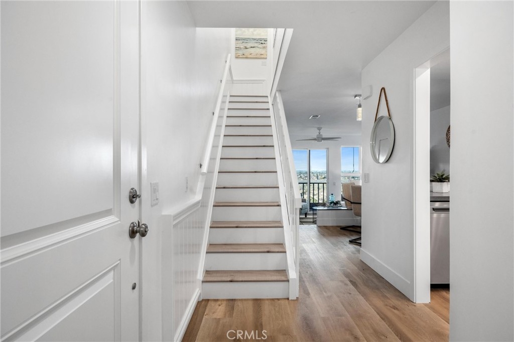 Be the first to live in this beautifully renovated property situated on an elevated lot in the Mesa Bluff community of Costa Mesa. Enjoy stunning views of the nature preserve during the day, then beautiful sunsets from your private balcony in the evening. Nearly everything in the home has been renovated, including the luxury vinyl flooring, recessed lighting, shaker cabinets, quartz countertops and custom windows. The kitchen, dining area, living room and balcony all flow together on the main floor, along with a half bathroom and fireplace, making this space perfect for entertaining guests. Up the stairs you will find the primary bedroom with the same fantastic views and exceptional natural light, along with the ensuite primary bathroom, boasting a dual vanity and walk-in shower. The secondary bedroom sits on the opposite end of the home with access to its own full bathroom. For maximum convenience, the washer and dryer hookups are also located on the second floor. This unit is perfectly situated in close proximity to its detached garage with new epoxy flooring, just steps from the front door. Enjoy the local parks and nature preserves or utilize the trails to easily access the beach.