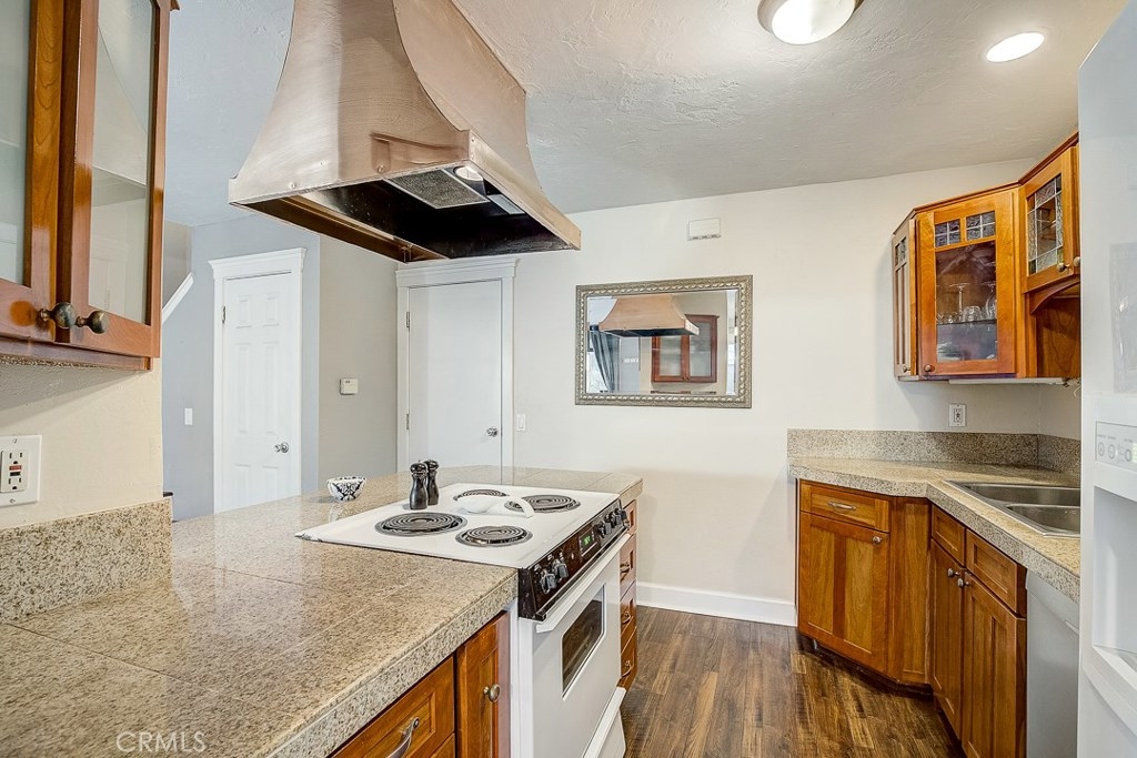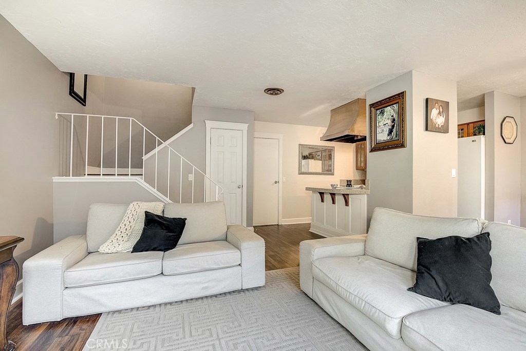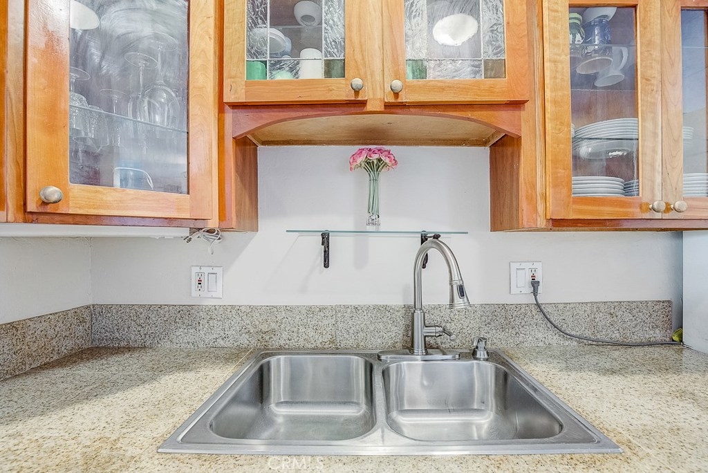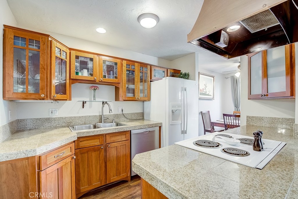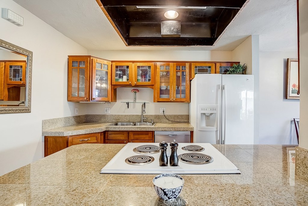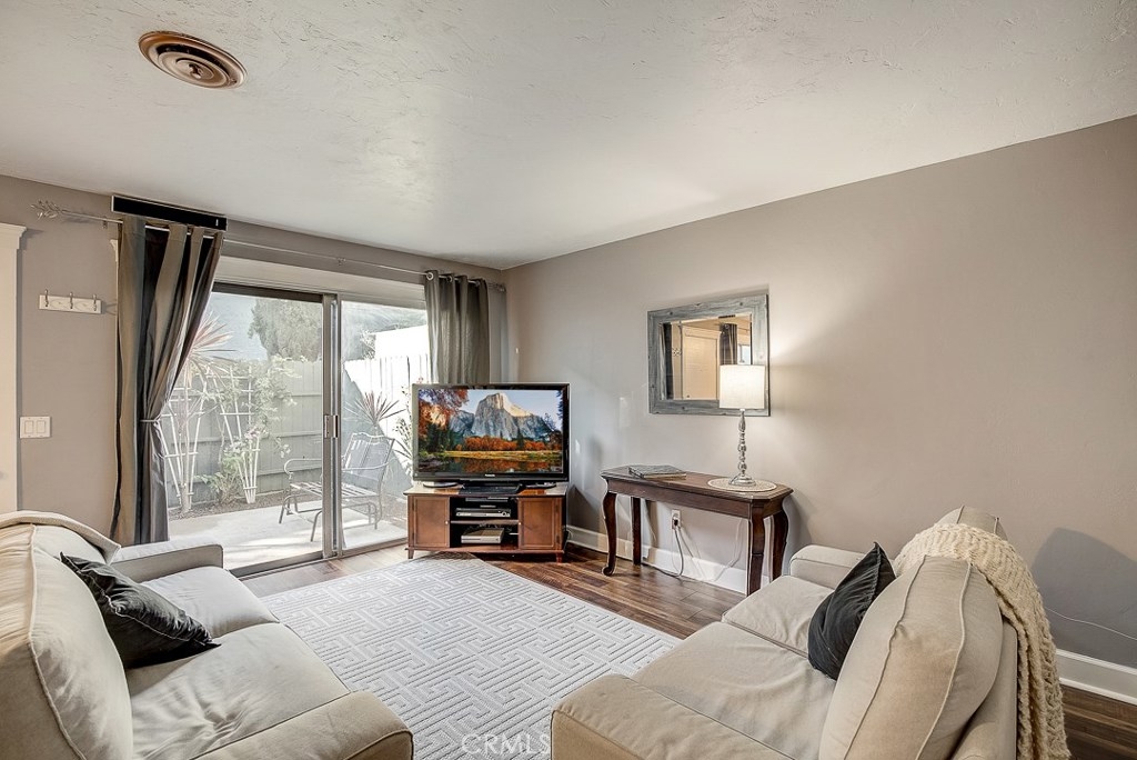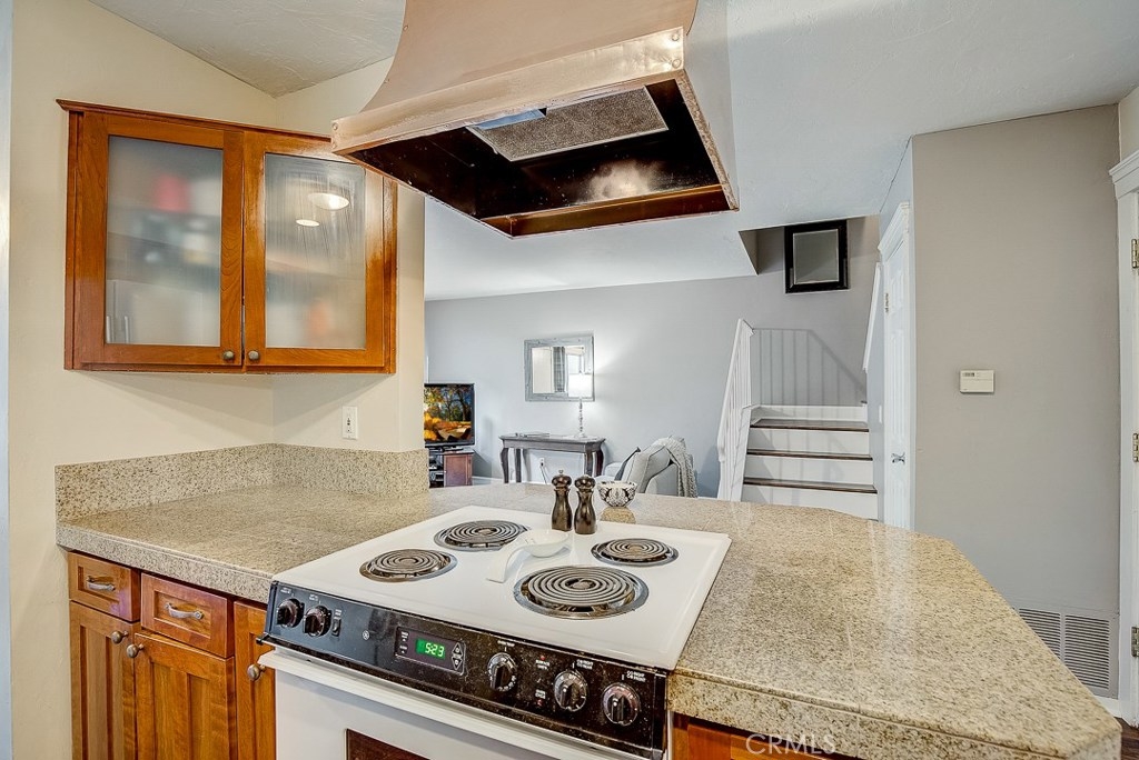 Priced to sell, this remodeled, Mesa Verde Villas townhome is truly move-in ready! It's the perfect place to start homeownership! From the private front patio enter into the open living spaces complemented with modern paint colors, wood laminate flooring, and textured ceilings. The kitchen has been remodeled with recessed lighting, granite counters, glass front wood cabinetry, and an impressive copper range hood! It has a convenient breakfast bar, too. The dining area is adjacent with a lighted fan. Up the stairs are two generous sized bedrooms and a full bath. The bedroom currently used as the master is king-sized and has a full wall of closets. The secondary bedroom is also good sized with plenty of storage. The full bath has a ceramic tile topped wood vanity, travertine flooring, and a full tub/shower with a sliding glass enclosure. The oversized one car garage is attached with direct access to the inside and full laundry connections. There's also a built-in workbench! Next to the garage is your own carport. Other upgrades include a new water heater, thick baseboards and dual paned vinyl windows upstairs. Well located close to shopping, schools, and freeway.