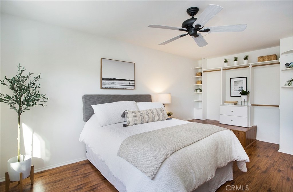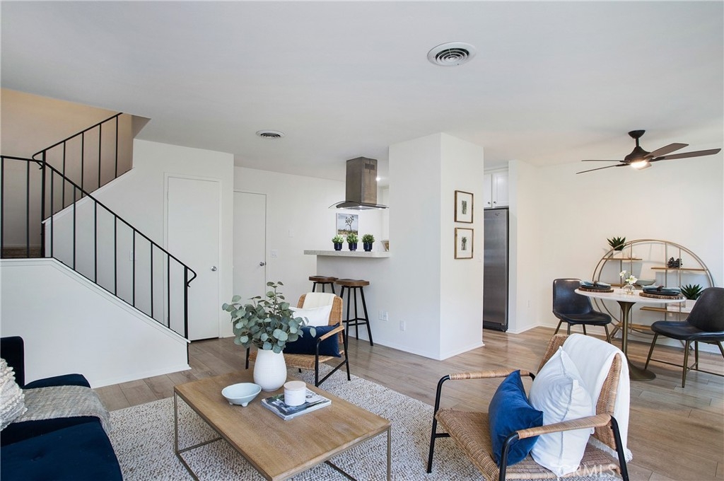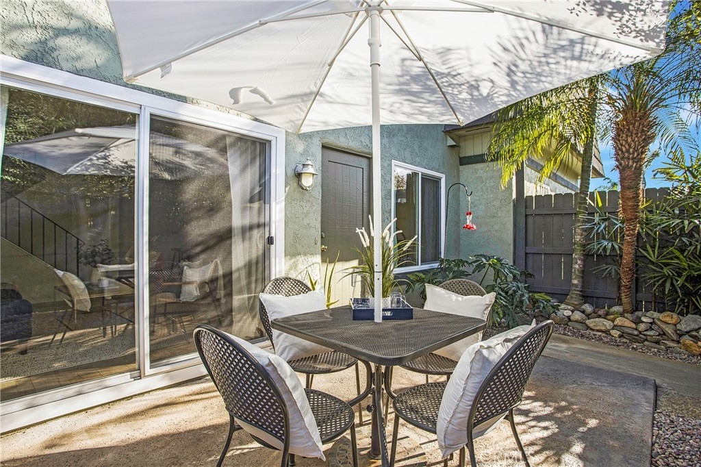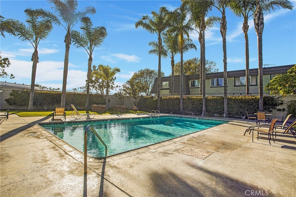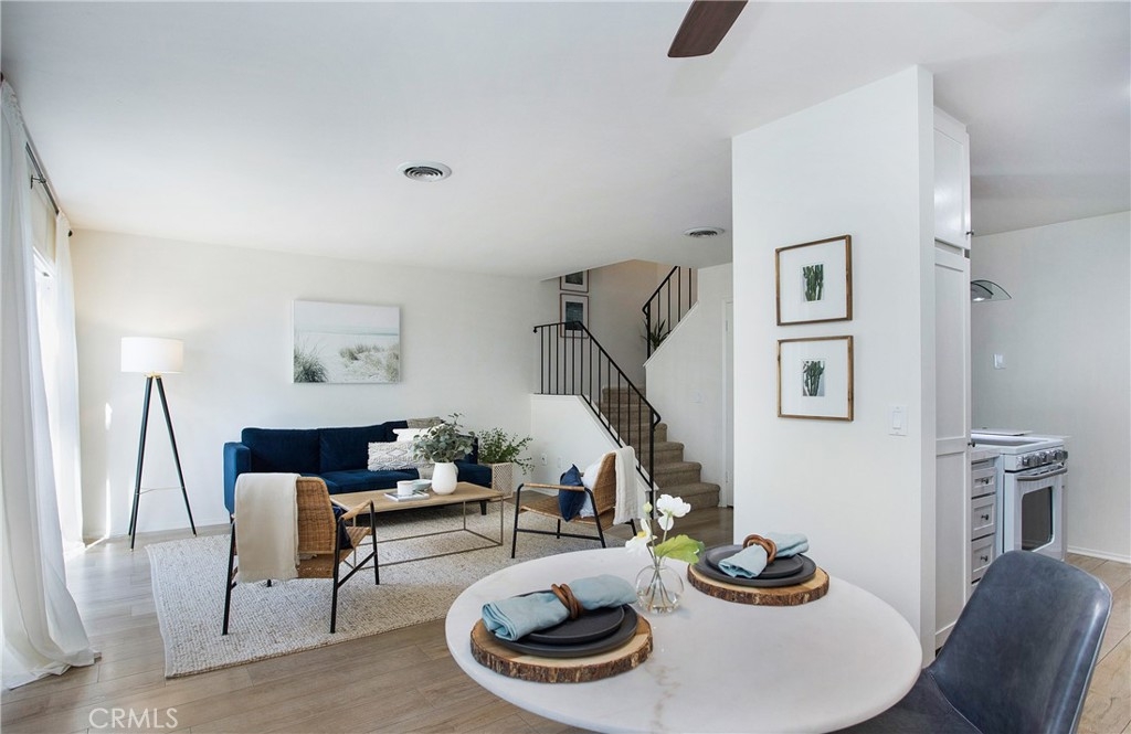 Welcome Home to Mesa Verde Villas in Costa Mesa! This immaculate 2 bedroom, 1 bath residence has been freshly painted throughout, creating a neutral palette complementary to exquisite warm-toned, wood laminate flooring. The tastefully renovated kitchen includes shaker style cabinets, Cambria Quartz countertops and backsplash, GE Retro Range, Everpure water purification system, oversized stainless steel sink and coordinating Honsgraphe sink fixture. Dual pane windows and a sliding door just off the dining/living room offer increased air flow and natural sunlight, with direct access to the custom landscaped patio where mature palms and silver sheen offer a peaceful retreat and privacy. Exterior walls and upstairs ceilings have been fully insulated for increased thermal protection. A hallway window has been added to enhance natural light upstairs. The spacious master bedroom features a ceiling fan with an open-concept closet and built-in shelving. The secondary bedroom can easily be used as a home office. Parking includes an attached garage with one additional designated parking space. Garage features include washer/dryer hookups, storage racks, and epoxy flooring. Washer, Dryer and Refrigerator INCLUDED! Ideally located steps from the community pool, walking distance to schools, parks, Mesa Verde Golf Course, Santa Ana River Trail, and a short bike ride to the beach, SOCO & the OC Mix, with convenient access to major freeways. This Mesa Verde beauty is move-in ready!