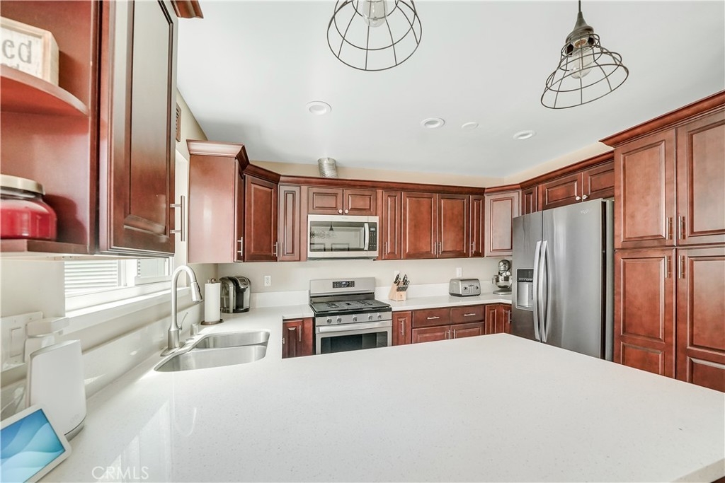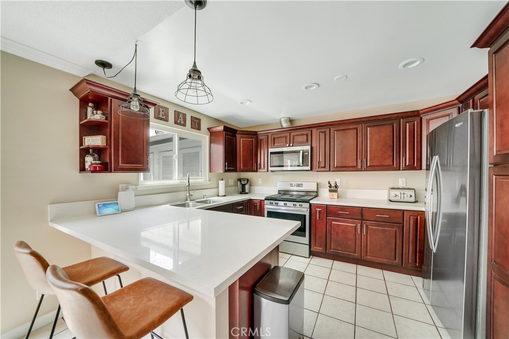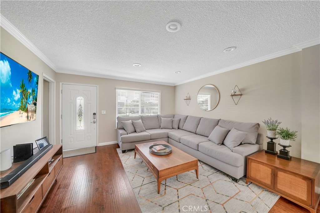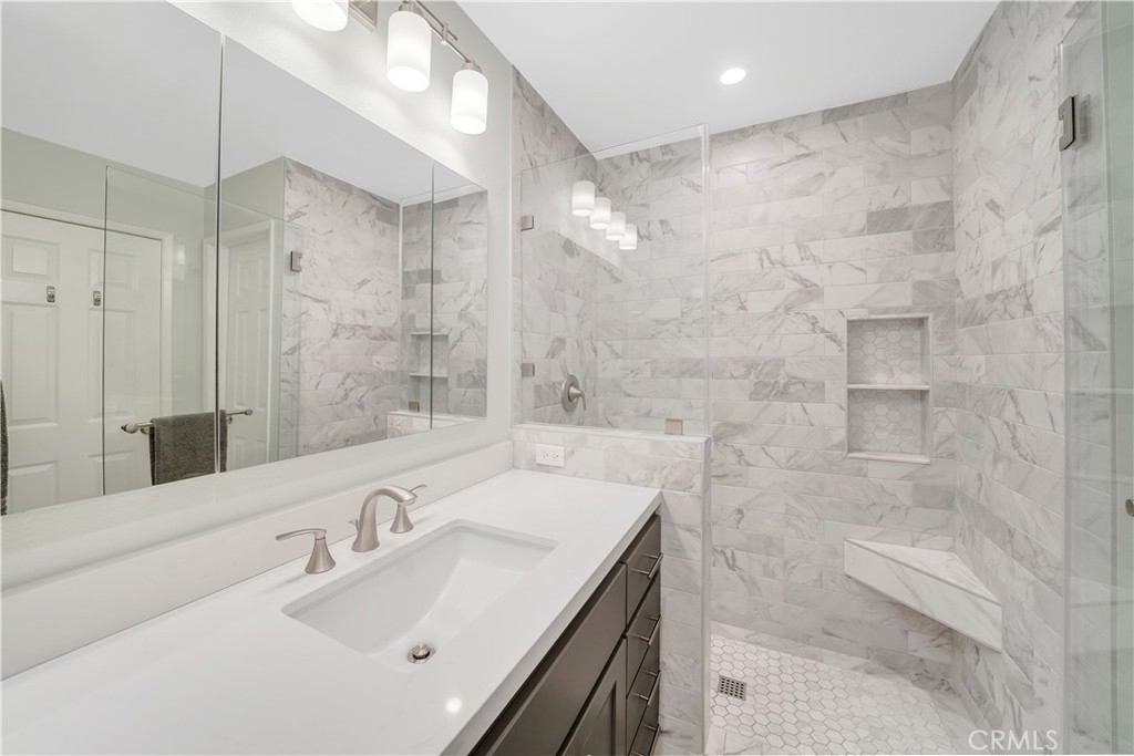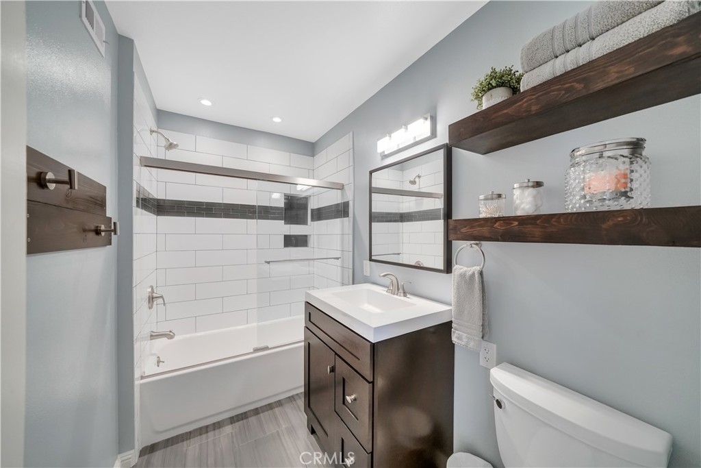 Wow! Experience the joy of being able to move right into your very own turnkey, UPDATED TOWNHOME with 3 bedrooms in the heart of Costa Mesa with AC! This is the largest and most popular 3-bedroom floorplan in the Monticello Townhomes community featuring 3 bedrooms on the second level. The main floor has an open living/dining/kitchen area with recently remodeled kitchen that features updated cabinets, white quartz counters, stainless steel appliances and pendant lighting over the breakfast bar. A private patio with quartz flooring and rustic bar plus a statement wall creates a unique and hip extension of the living space. An expanded modern bathroom with bathtub completes the main level. Upstairs there are three bedrooms – the primary bedroom has been modernized with a barn door entry to the giant walk-in closet. Two secondary bedrooms have views of the quiet greenbelt. Another modern bathroom with chic walk-in shower rounds out the upstairs. An oversized 2-car garage is located through the patio and provides ample parking and storage. Residents are also given one parking pass for use in any permit space on a first-come/first-serve basis. Other highlights include CENTRAL AIR & heating, whole house fan, private laundry, recessed lighting, ceiling fans, crown molding, laminate flooring, and NO CARPET. It is also situated on a scenic courtyard with charming curb appeal (due to a recent painting/woodwork project) that is great for socializing, pets or kids. There is also the possibility of creating your own front patio as many other homeowners have done (with HOA approval). The community has low HOA dues and offers 2 sparkling pools, hot tubs, a clubhouse that residents can rent, and popular holiday events that bring the community together. Prime location with easy access to the 55/405/73 freeways and a quick 10 minute drive to the beach (plus discounted fair tickets!) Located across from Vanguard University, these properties make excellent investments as well. FHA/VA ok. No Mello Roos, no land lease. Low HOA – dues include water and trash! This is one you won’t want to miss since homes in this complex sell quickly due to the prime location and excellent value for Costa Mesa. This is what home should feel like!
