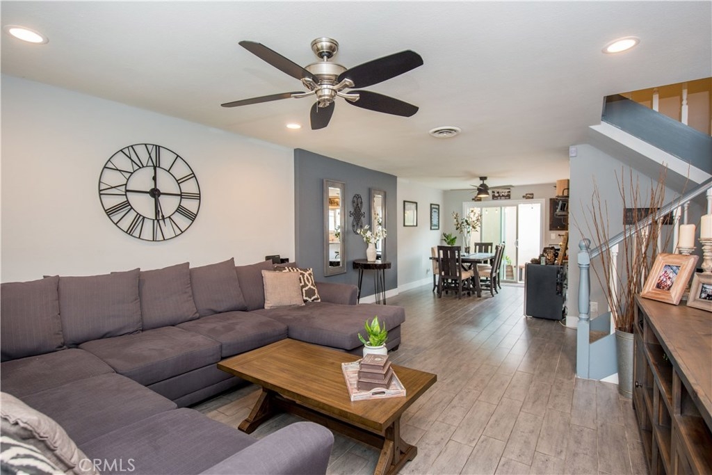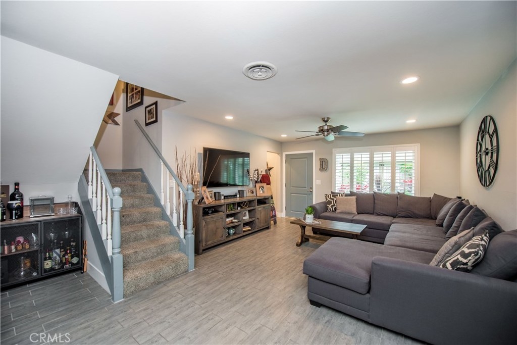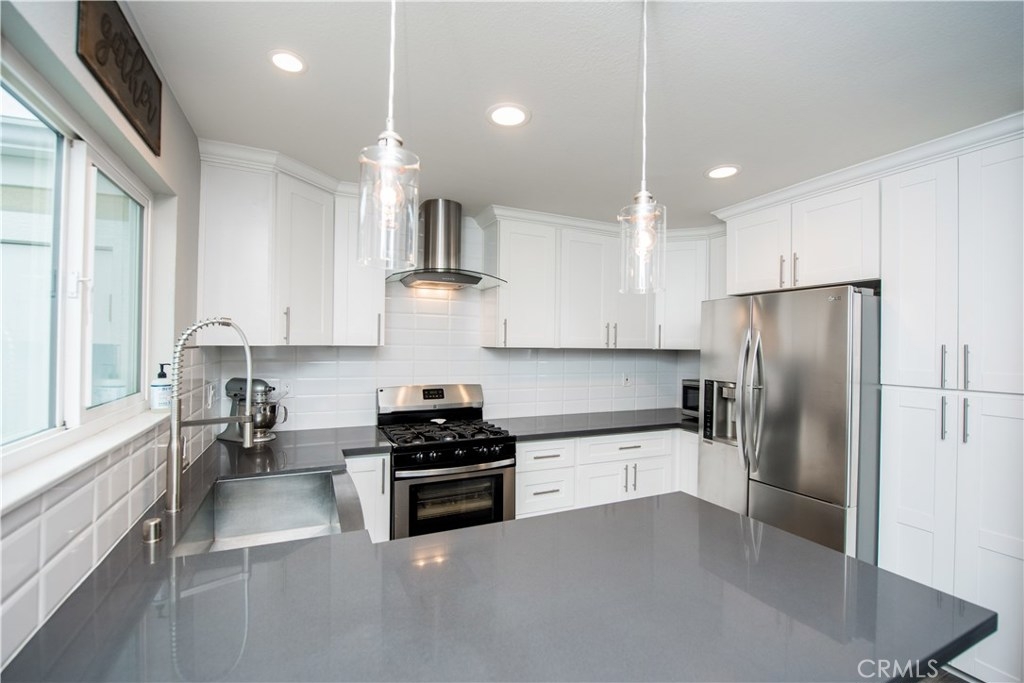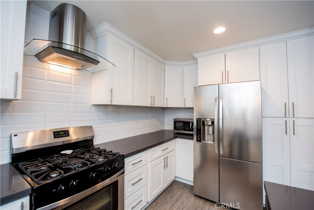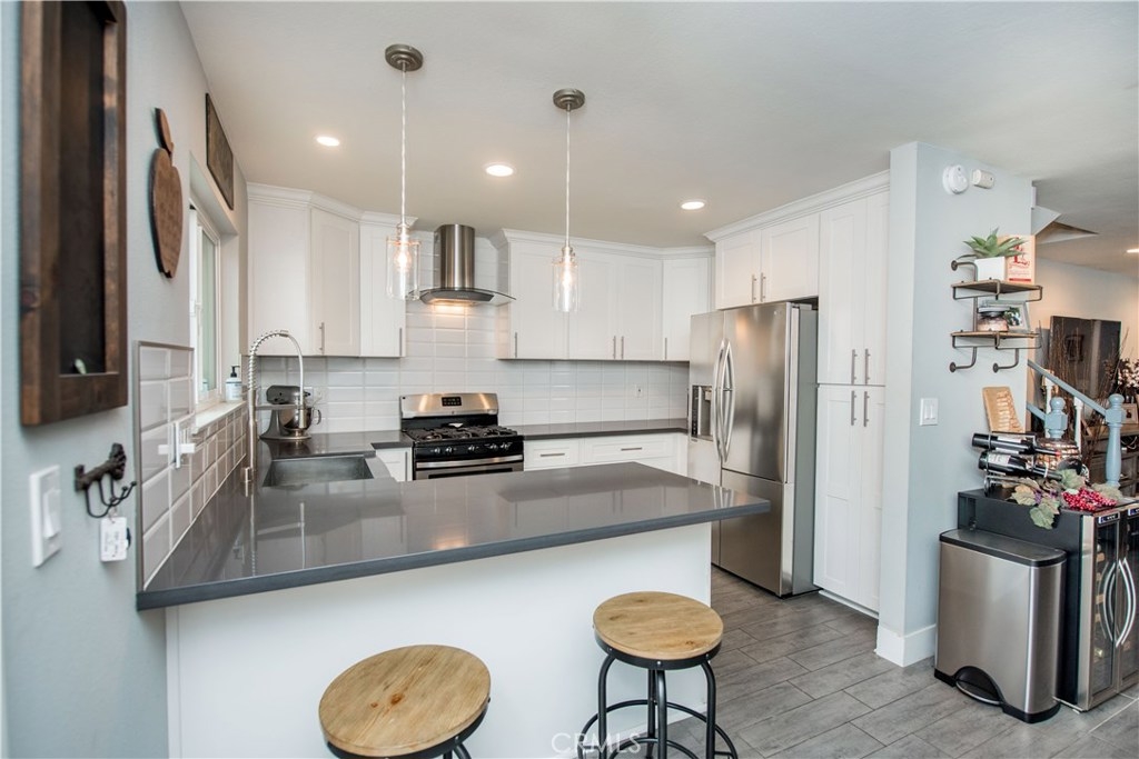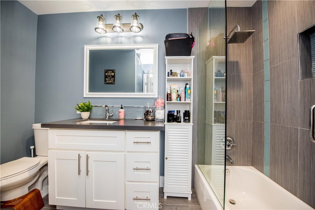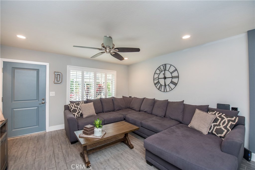 Perfectly upgraded 3 bedroom townhome in the popular Monticello community. The main level is adorned with gorgeous gray-toned porcelain tile floors and features a spacious living room, dining area, gorgeously redone guest bathroom with shower, and the perfect kitchen. The kitchen is absolutely gorgeous, boasting amenities such as: new cabinetry, custom tile backsplash, quartz counter tops, oversized sink, pendant lighting, and stainless steel appliances. Upstairs are three comfortable bedrooms and an additional full bathroom. The slider downstairs leads to a private enclosed patio and your 2 car garage, both of which are coated in a high grade epoxy flooring. Other features include: recessed lighting, custom tile walls and showers in bathrooms, Barn door for walk in closet, and more! HOA dues include water and trash. Located conveniently near freeway access, the Orange County Fairgrounds, and amazing shopping and dining. This is one opportunity you do not want to let pass you by