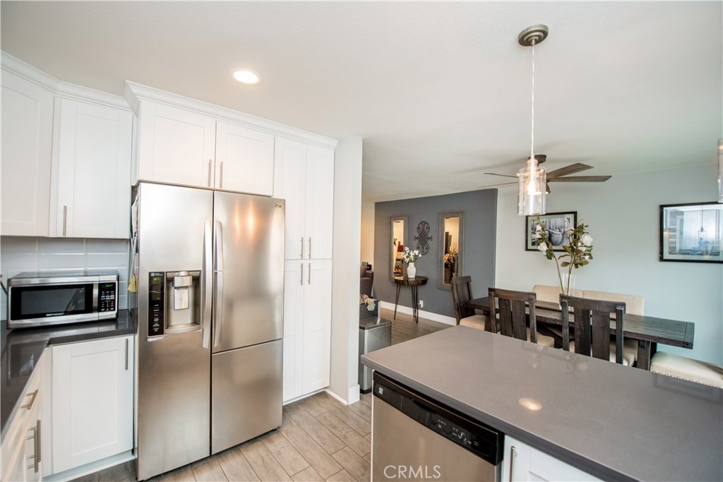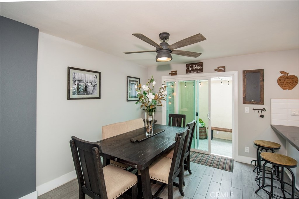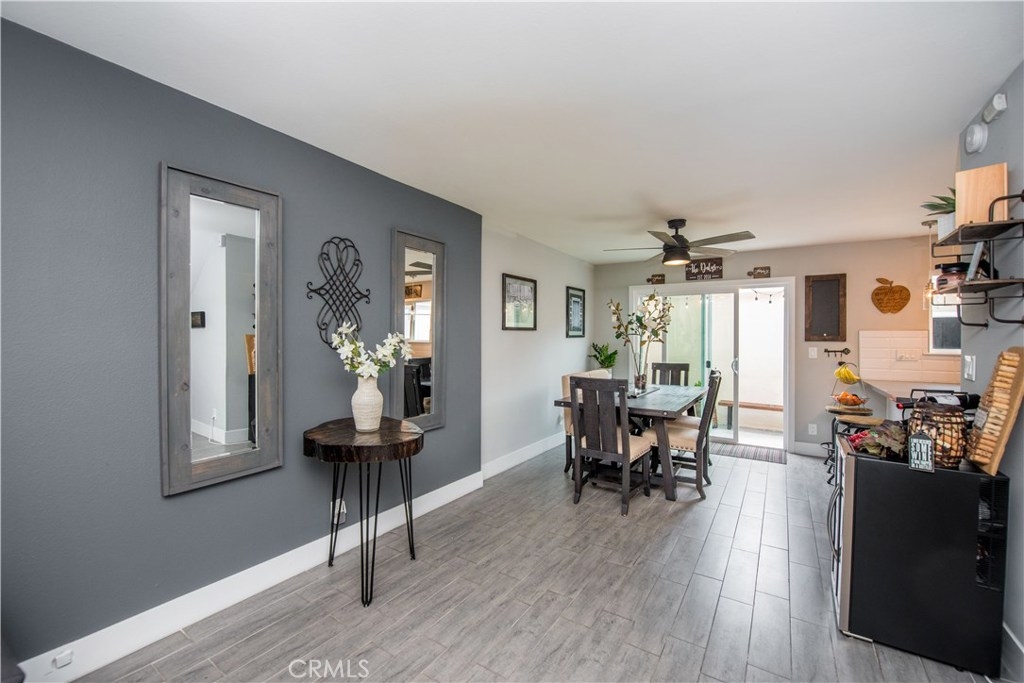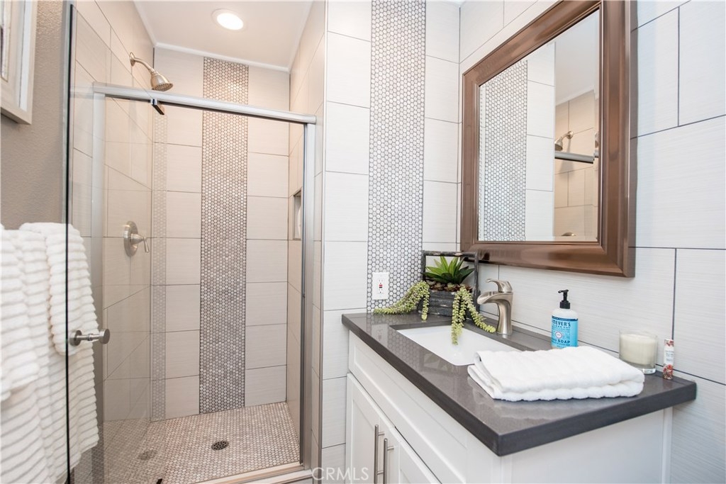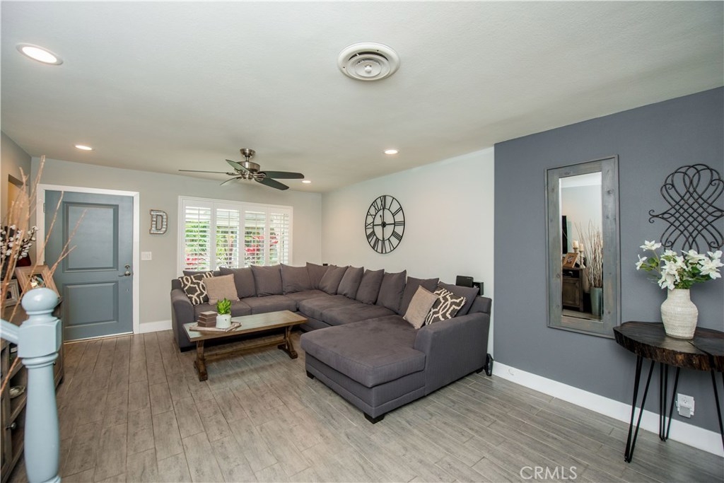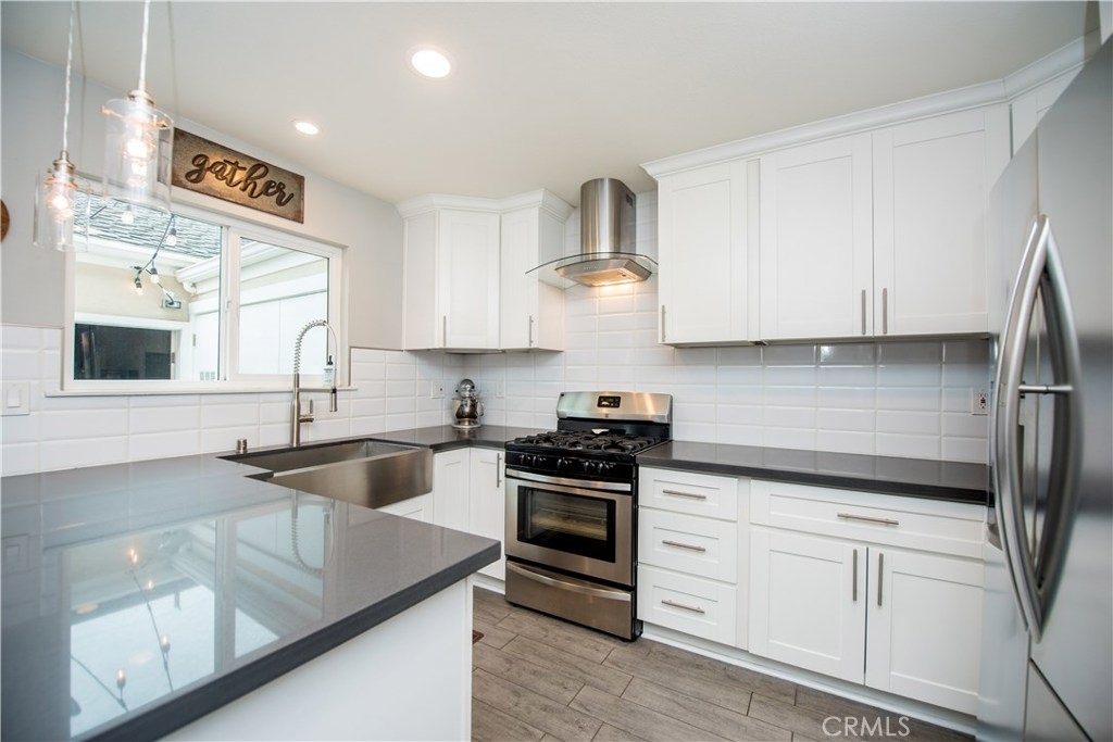 Perfectly upgraded 3 bedroom townhome in the popular Monticello community. The main level is adorned with gorgeous gray-toned porcelain tile floors and features a spacious living room, dining area, gorgeously redone guest bathroom with shower, and the perfect kitchen. The kitchen is absolutely gorgeous, boasting amenities such as: new cabinetry, custom tile backsplash, quartz counter tops, oversized sink, pendant lighting, and stainless steel appliances. Upstairs are three comfortable bedrooms and an additional full bathroom. The slider downstairs leads to a private enclosed patio and your 2 car garage, both of which are coated in a high grade epoxy flooring. Other features include: recessed lighting, custom tile walls and showers in bathrooms, Barn door for walk in closet, and more! HOA dues include water and trash. Located conveniently near freeway access, the Orange County Fairgrounds, and amazing shopping and dining. This is one opportunity you do not want to let pass you by