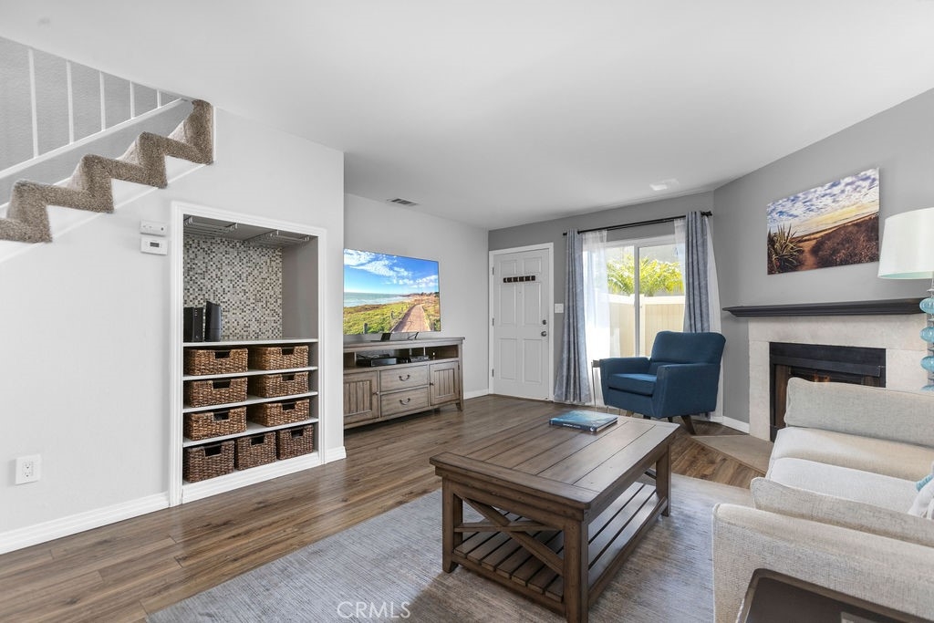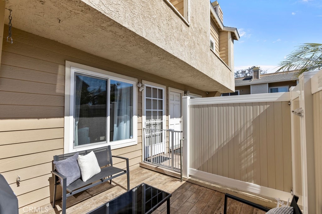 This stylish home offers an open-concept layout designed for modern living, featuring durable wood laminate flooring with a driftwood-inspired finish, wide baseboards, smooth ceilings, and upgraded interior doors and windows. A sleek travertine-faced gas fireplace adds warmth to the space, while a designer-inspired color palette enhances the contemporary feel. Nestled in a private and ideal location with no unit behind it, this home offers a rare level of privacy.The kitchen is both functional and elegant, boasting quartz countertops, a spacious breakfast bar, and custom wood cabinetry with soft-close doors. High-end stainless steel appliances, including a counter-depth refrigerator, complement the space, along with custom lighting and premium fixtures. A private balcony, accessible through sliding doors, extends the living area outdoors.The guest bathroom showcases a refined design with a Carrera-topped wood vanity and framed mirror. Upstairs, two generously sized bedrooms each feature their own ensuite bathrooms, thoughtfully updated with modern tile flooring, newly tiled tubs and showers with built-in shampoo niches, frameless glass doors, and solid surface vanities. Plush carpeting, ceiling fans, and wood blinds enhance the comfort of the bedrooms.Additional highlights include a one-car garage, additional outdoor storage, private laundry, and prime location in the community. This home is conveniently close to the beach, shopping along 17th Street, and the vibrant Triangle Square district.