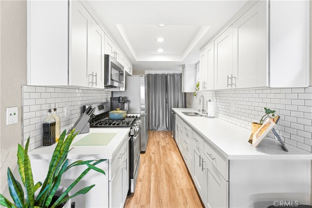 Welcome to this stunning, updated end-unit home designed for modern coastal living! Step through the private, gated entry and into a bright open floor plan featuring new contemporary wood laminate flooring, dual-pane windows, and designer touches throughout. The stylish kitchen boasts crisp white cabinetry, quartz countertops, and stainless steel appliances, opening seamlessly to the dining area and spacious living room—complete with a cozy fireplace accented with custom subway tile. Relax and entertain on your private patio while enjoying ocean breezes and panoramic views. Both bedrooms are generously sized and positioned on opposite sides of the home, ensuring comfort and privacy. The primary suite overlooks serene views and offers a beautifully remodeled ensuite bath with a dual-sink vanity and modern finishes. Additional highlights include in-unit laundry, a private garage, and a prime location close to trails, beaches, top-rated schools, shopping, and restaurants. Just steps from Fairview Park—perfect for outdoor adventures and summer concerts!