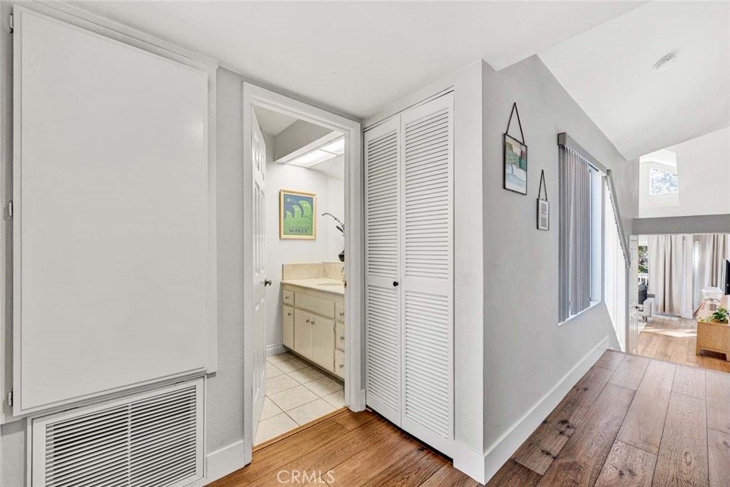 Absolutely stunning, beautifully upgraded Pentridge Cove luxury condo. This model-perfect 2 bedroom, 2 bath home with a 2-car garage, boasts new central air conditioning, soaring cathedral ceilings, newer rustic hardwood flooring, high transom windows for lots of natural light, raised panel interior doors, fresh designer paint, high baseboards, and dual pane windows with custom casements. Homeowner's currently use garage as a home office equiped with WiFi! The elegant living room showcases a granite fireplace with handcrafted wood surround and mantel. The remodeled kitchen is a Chef's delight with Quartz countertops, subway tile backsplash, coffered ceiling, recessed lighting, extra large sink, designer faucet, electric range, dishwasher, stainless microwave and counter-depth refrigerator. It has a lovely dining room that is open to both the kitchen and living room and sliding glass doors leading to an serine oversized deck/balcony/patio that overlooks the streams and tropical forest trees - such a tranquil place to relax and entertain! The spacious primary suite with cathedral ceiling has his & hers mirrored closets and an upgraded bathroom that includes dual sinks, a soaking tub, and a separate shower with tile surrounds, mosaic tile inlay, and a clear glass shower door. The secondary bedroom is adorable with bead board wainscoting, a delightful window seat, cathedral ceiling, and mirrored closet. There is also a convenient inside laundry closet and an upgraded electrical panel. Pentridge Cove is a highly desired community with resort-style pool and spa. It is walking distance to restaurants, pubs, coffee shops, and boutique shopping at both The Lab and The Camp. It is also very close to South Coast Plaza, Segerstrom Center for the Arts, and white sand beaches. Immerse yourself in the allure of this remarkable home and embrace a lifestyle defined by beauty, tranquility, and convenience.