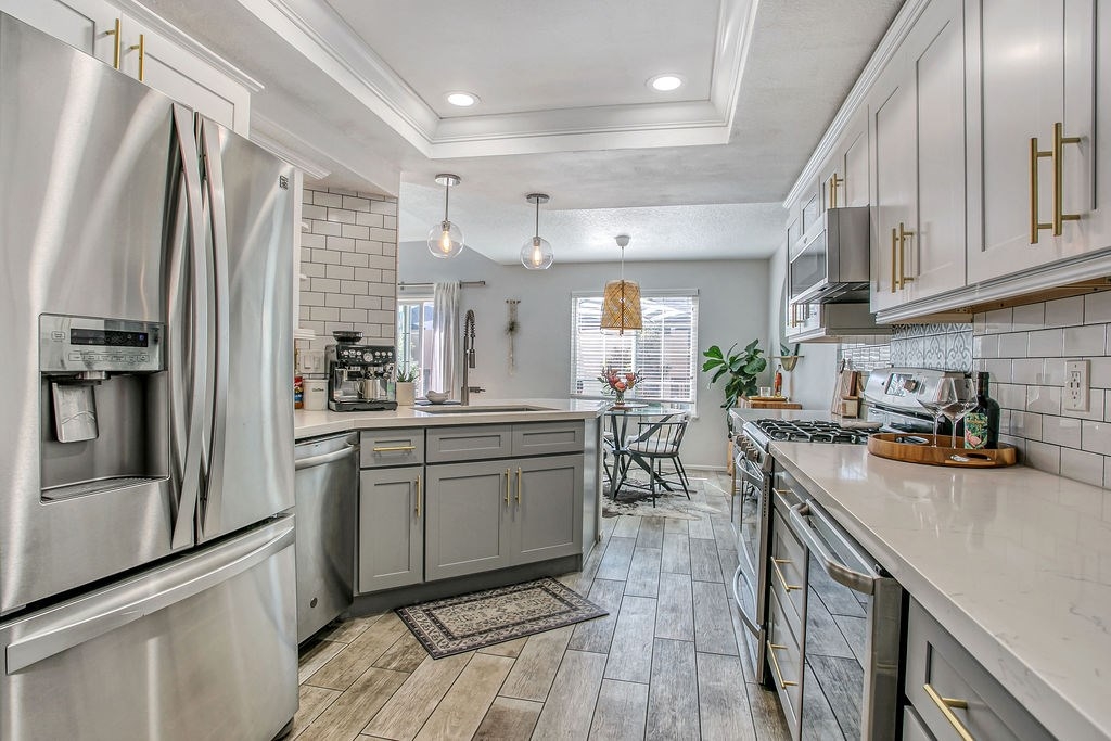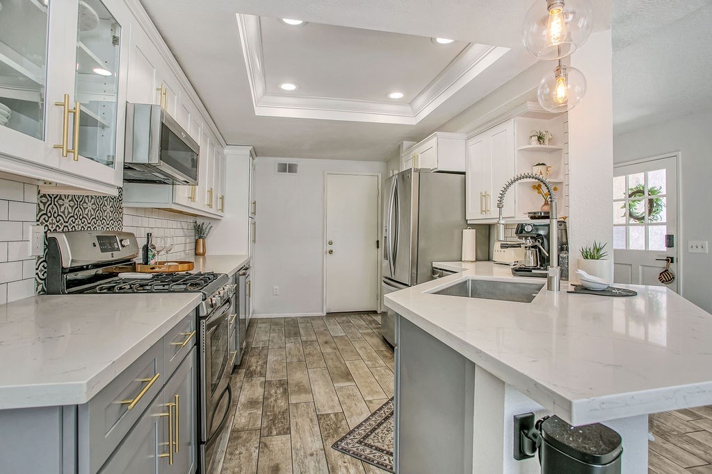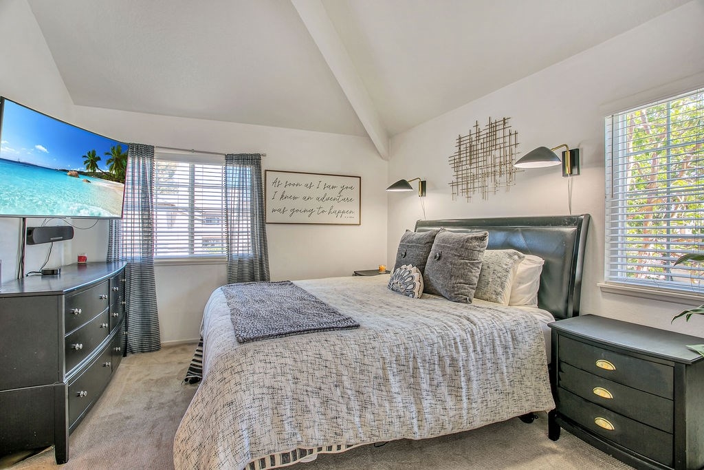 Beautiful townhome in the very desirable gated San Michel complex! This home boasts an absolutely gorgeous, newly remodeled kitchen completed in 2018 with designer cabinets, quartz countertops, updated appliances including a wine fridge, microwave, six burner gas stove with convection oven, dishwasher, subway tile backsplash, large stainless farmhouse sink with stainless goose neck faucet. Newer wood look porcelain tile floors downstairs, newer A/C unit, high cathedral ceilings bringing in lots of natural light, large patio with artificial turf making it very pet friendly, gas fireplace with designer tile, spacious loft, new paint, Ecobee Smart Home thermostat, Phillips Hue smart lights, master bedroom with en suite bathroom, shower in tub in both upstairs bathrooms, walk in closet in master, attached oversized two car garage with convenient entry into the kitchen, laundry and newer Closet World cabinets in garage and so much more! This highly upgraded home is situated in an interior location. San Michel is a wonderful townhome community with a sparkling pool, jacuzzi and low HOA dues!