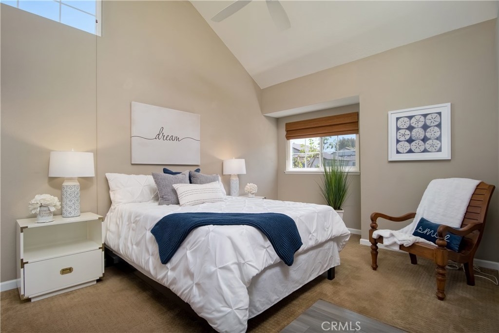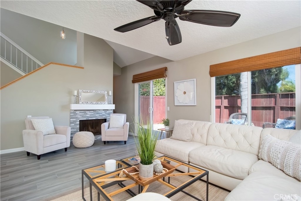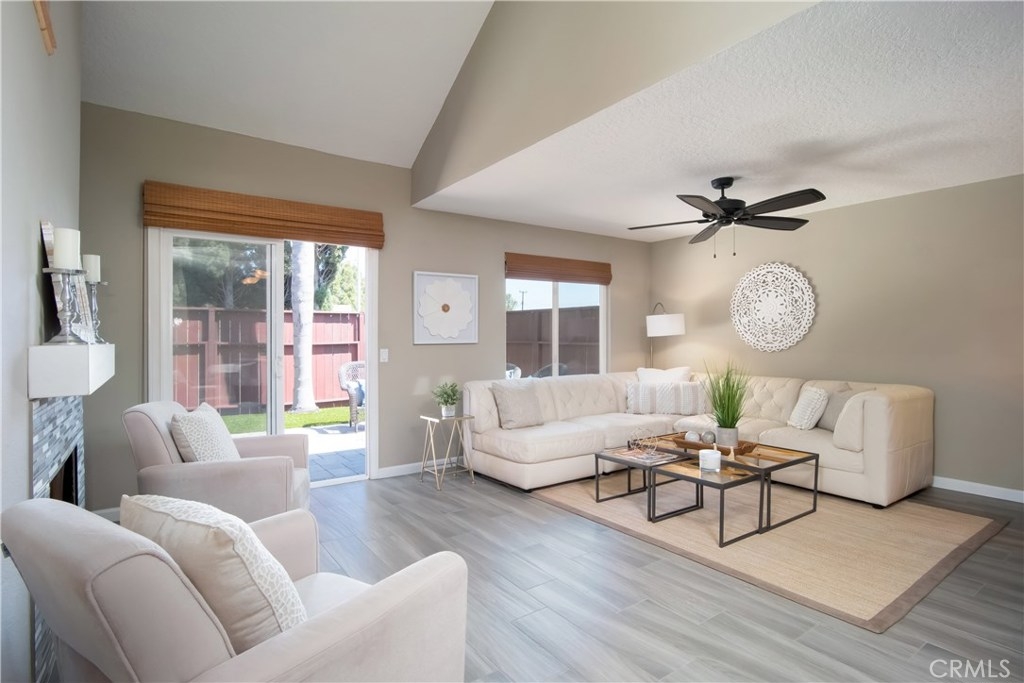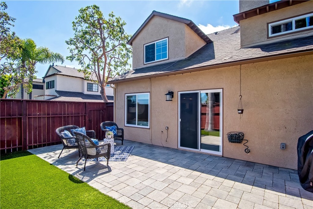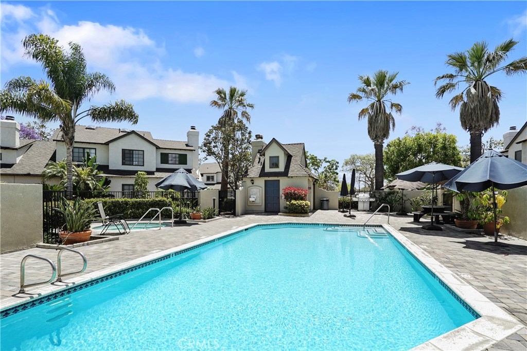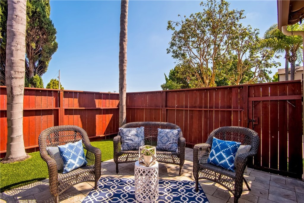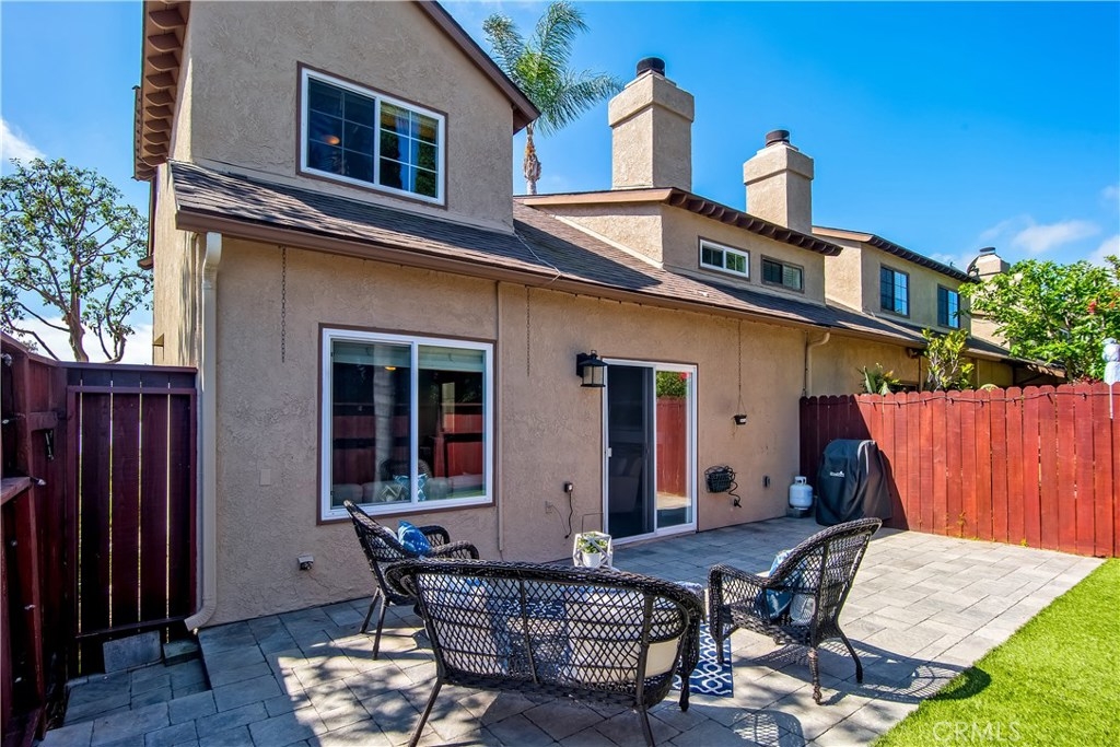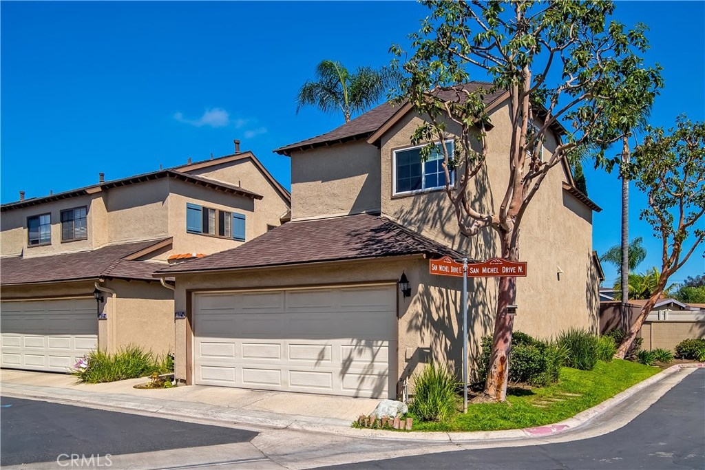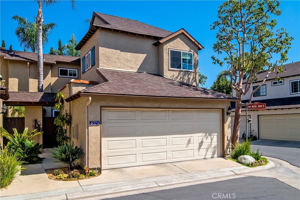 Just under three miles to the beach, this fully renovated end unit townhome boasts smart design, a clean color palette, and a spacious floor plan with vaulted ceilings. The downstairs statement window welcomes heaps of natural light creating an airy open space. The remodeled kitchen features white shaker style cabinets, quartz countertops, farmhouse sink, full tile backsplash, and stainless steel appliances. Beautiful tile wood floors stretch throughout the first floor and hall upstairs. There is an updated mosaic tile fireplace and peak around the fireplace to find a large storage area. Walking through the sliding glass doors, you will find a large private patio and yard that has been upgraded with paver stones and artificial grass. Upstairs you will find two master bedrooms each with their own remodeled full bathrooms. The spacious rooms have vaulted ceilings and ceiling fans. The home also has an oversized two car garage with direct access to the kitchen, dual pane windows throughout, recently painted interior, newer interior doors, newer furnace and hot water heater. Great location within the community. San Michel is a quiet gated community offering a pool, spa and BBQ area with a low $239/month HOA. This is a must see.