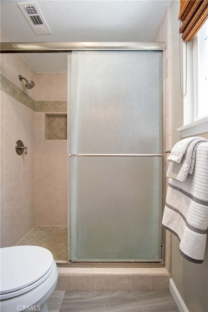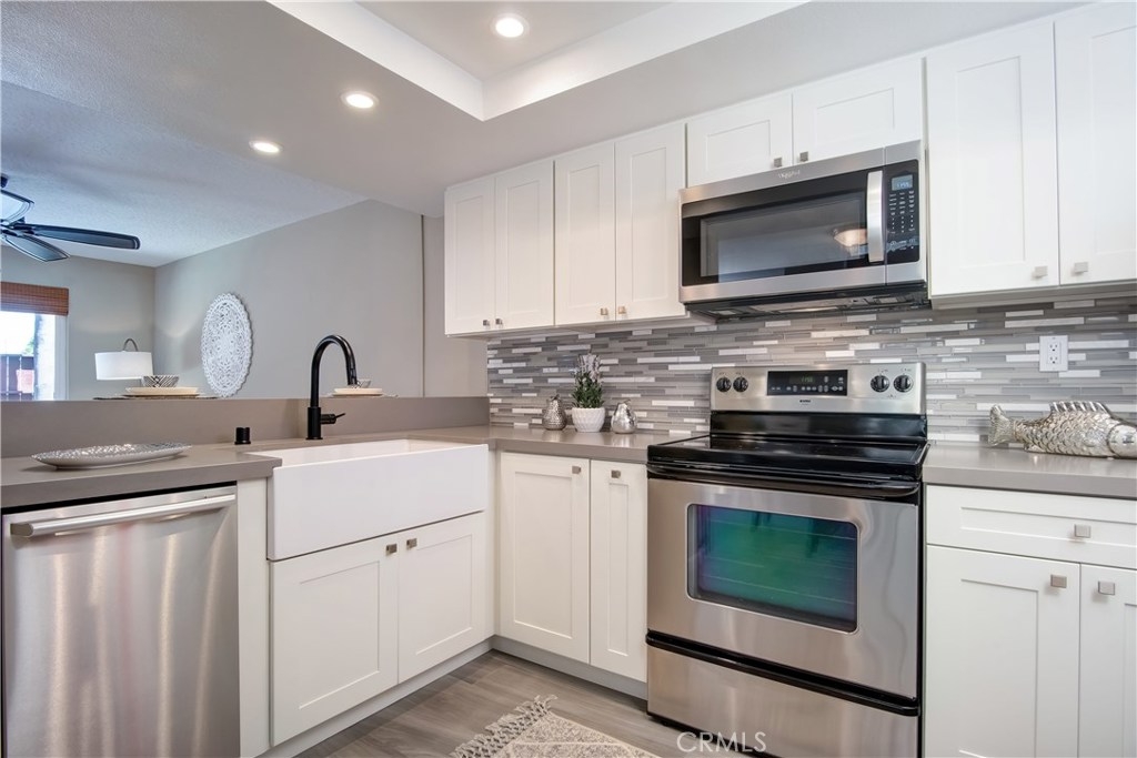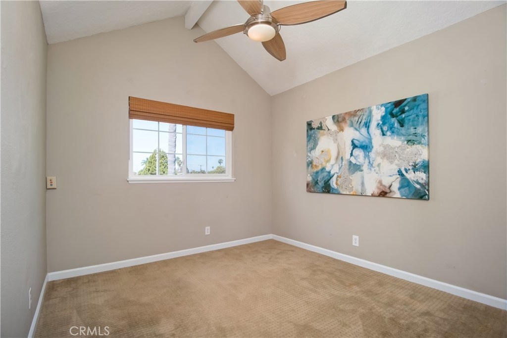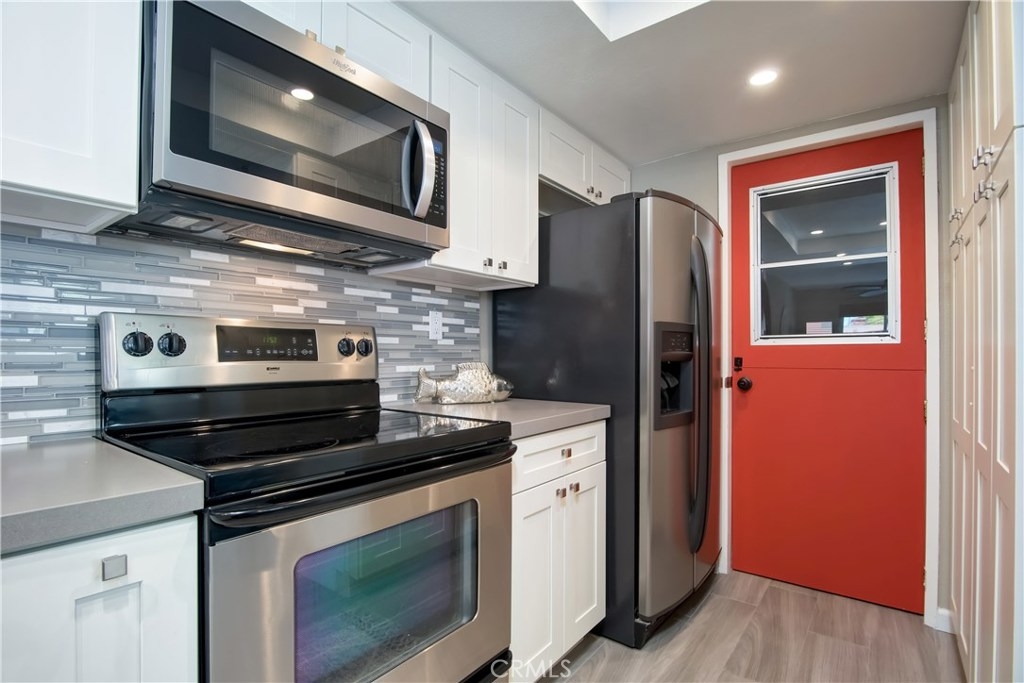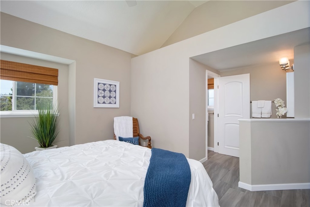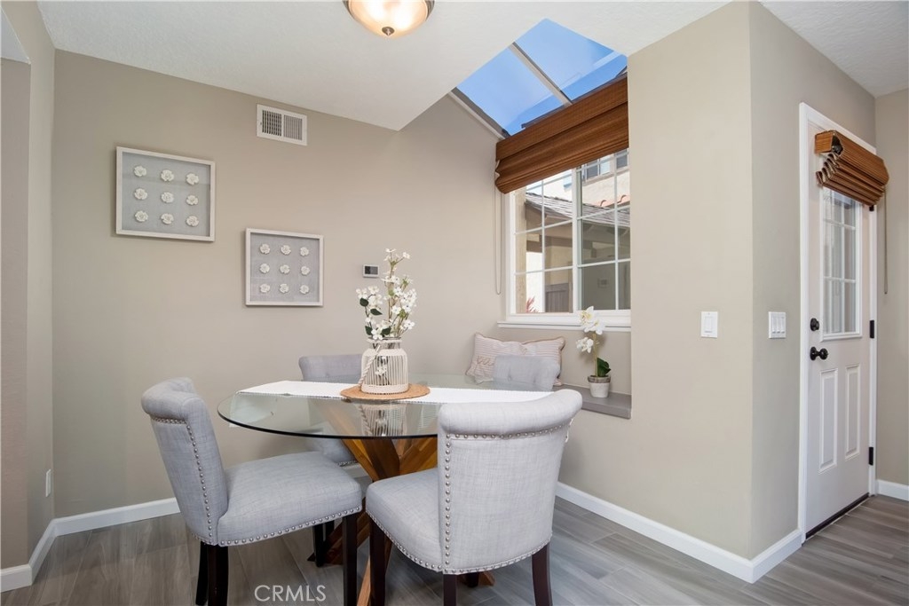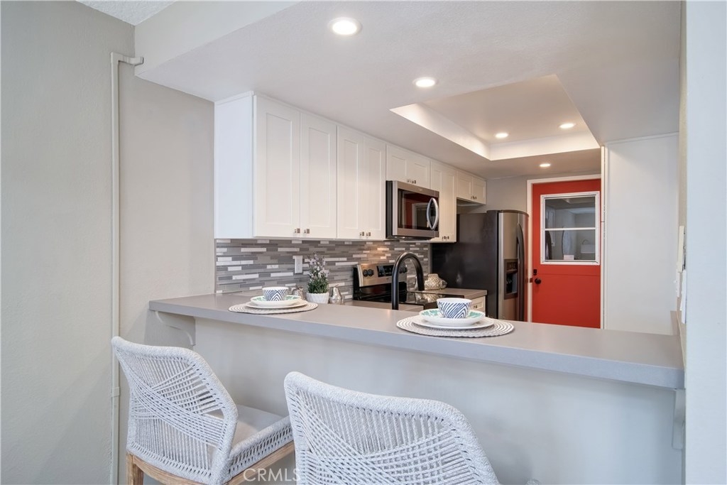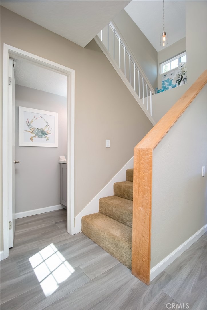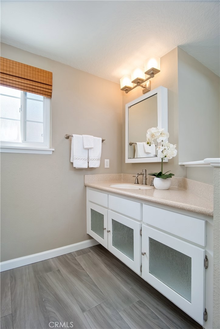 Just under three miles to the beach, this fully renovated end unit townhome boasts smart design, a clean color palette, and a spacious floor plan with vaulted ceilings. The downstairs statement window welcomes heaps of natural light creating an airy open space. The remodeled kitchen features white shaker style cabinets, quartz countertops, farmhouse sink, full tile backsplash, and stainless steel appliances. Beautiful tile wood floors stretch throughout the first floor and hall upstairs. There is an updated mosaic tile fireplace and peak around the fireplace to find a large storage area. Walking through the sliding glass doors, you will find a large private patio and yard that has been upgraded with paver stones and artificial grass. Upstairs you will find two master bedrooms each with their own remodeled full bathrooms. The spacious rooms have vaulted ceilings and ceiling fans. The home also has an oversized two car garage with direct access to the kitchen, dual pane windows throughout, recently painted interior, newer interior doors, newer furnace and hot water heater. Great location within the community. San Michel is a quiet gated community offering a pool, spa and BBQ area with a low $239/month HOA. This is a must see.