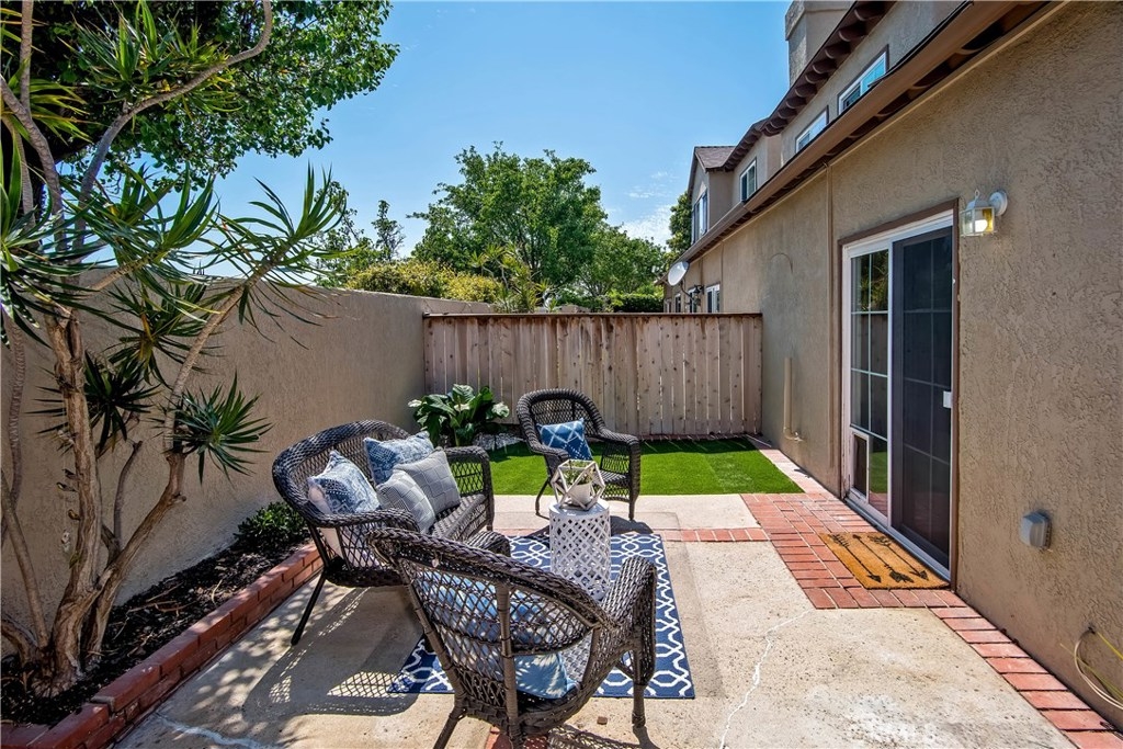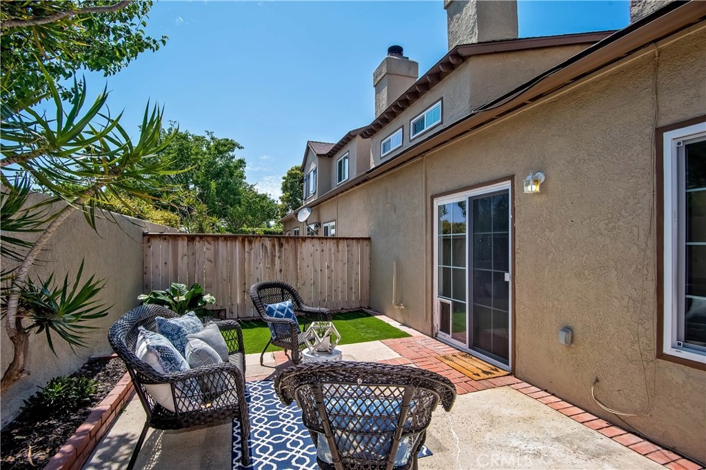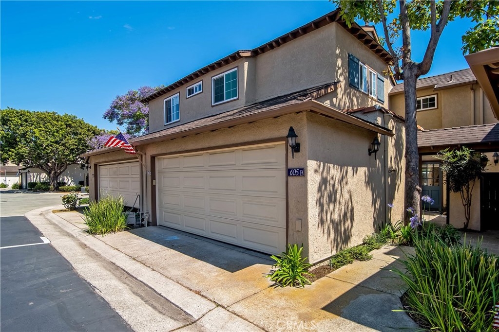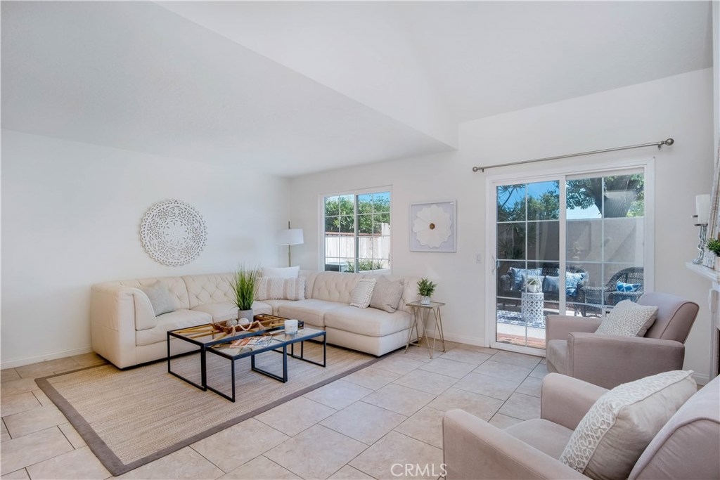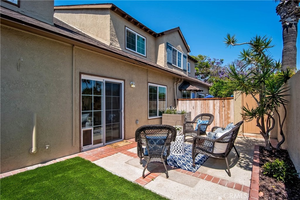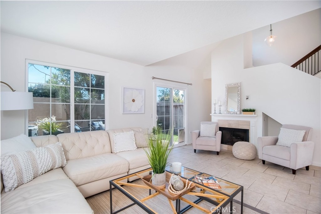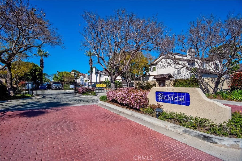 Located in a gated community just under three miles to the beach, this remodeled townhome boasts smart design, a clean color palette, and a spacious floor plan with vaulted ceilings. The downstairs statement window welcomes heaps of natural light creating an airy open space. The remodeled kitchen features white shaker style cabinets, quartz countertops, single bowl sink, full tile backsplash, and stainless steel appliances. Beautiful tile floors stretch throughout the first floor and wood laminate through the second floor. There is a gas fireplace in the living room and peek around the fireplace to find a large storage area. Walking through the sliding glass doors, you will find a large patio and yard with artificial grass. Upstairs you will find two spacious master bedrooms with vaulted ceilings, and each with their own full bathrooms. The home also has an oversized two car garage with direct access to the kitchen, dual pane windows throughout, recently painted interior, newer furnace, and Central A/C. The roof is approximately two years old. San Michel is a quiet gated community offering a pool, spa, and BBQ area with a low $239/month HOA. This is a must see.