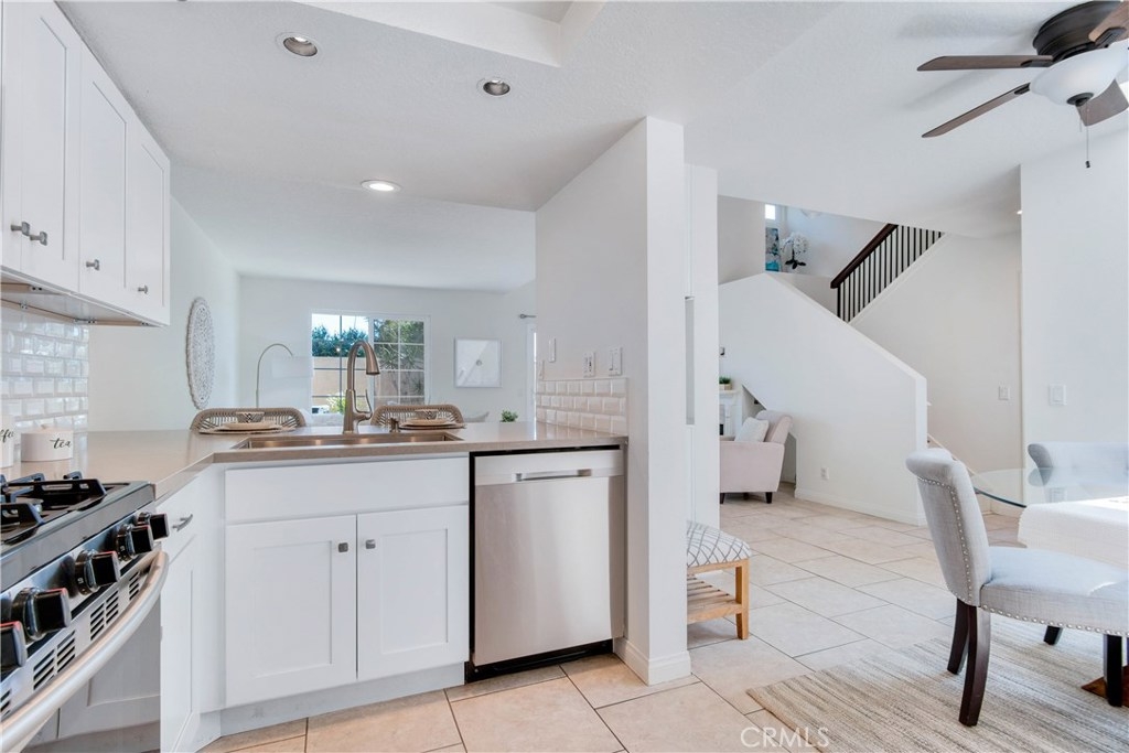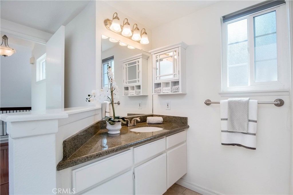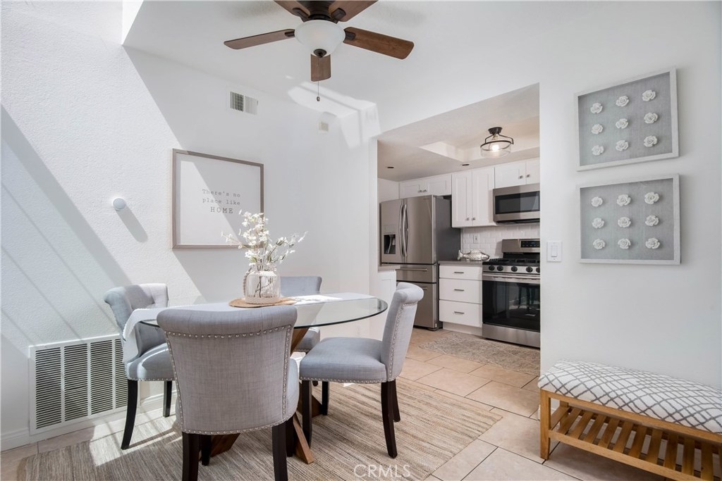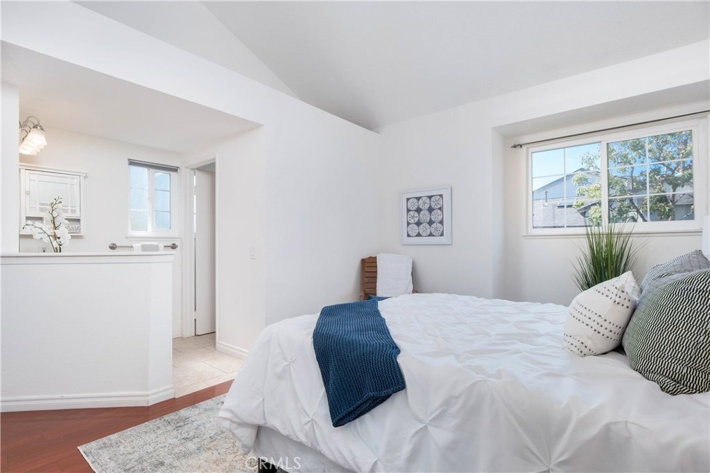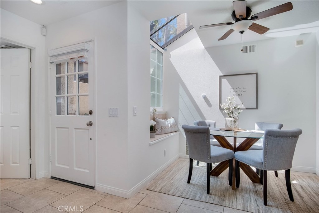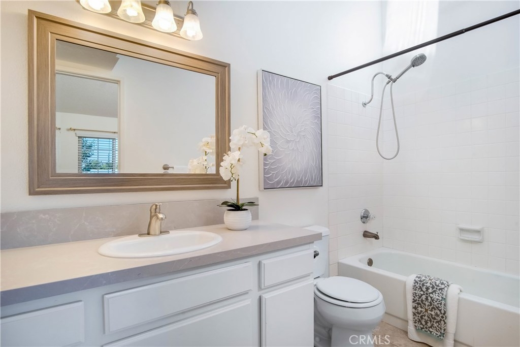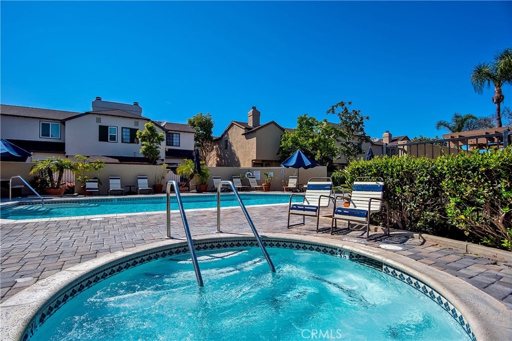 Located in a gated community just under three miles to the beach, this remodeled townhome boasts smart design, a clean color palette, and a spacious floor plan with vaulted ceilings. The downstairs statement window welcomes heaps of natural light creating an airy open space. The remodeled kitchen features white shaker style cabinets, quartz countertops, single bowl sink, full tile backsplash, and stainless steel appliances. Beautiful tile floors stretch throughout the first floor and wood laminate through the second floor. There is a gas fireplace in the living room and peek around the fireplace to find a large storage area. Walking through the sliding glass doors, you will find a large patio and yard with artificial grass. Upstairs you will find two spacious master bedrooms with vaulted ceilings, and each with their own full bathrooms. The home also has an oversized two car garage with direct access to the kitchen, dual pane windows throughout, recently painted interior, newer furnace, and Central A/C. The roof is approximately two years old. San Michel is a quiet gated community offering a pool, spa, and BBQ area with a low $239/month HOA. This is a must see.
