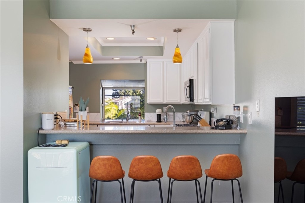 Welcome home to this incredible two-story condo in Costa Mesa with stunning views and a prime location next to the Talbert Nature Preserve. Enjoy 180-degree views from the spacious balcony, where you can watch sunsets over Huntington Beach, SpaceX rocket launches, fireworks from neighboring cities, and even spot the Hollywood Sign on clear days. Ideally situated close to Huntington Beach, Newport Beach, a variety of parks, outdoor activities, shopping, and dining. This split-level unit boasts high ceilings that create an airy and light-filled living and entertaining space upstairs. The open-concept kitchen features granite countertops, ample counter space, a breakfast bar, and a separate dining area. The appliances have been upgraded- New photos to follow. The living room, complete with a fireplace and expansive sliding glass doors, is bathed in natural light, offering spectacular day-and-night views. Elegant wood shutters enhance the home’s style, providing both shade and privacy. Downstairs, you’ll find two primary suites, each with en-suite bathrooms. Terracotta tile floors beautifully complement the sage green and white color palette. A concealed storage area beneath the stairs offers abundant storage, while upper and lower cabinets provide additional storage. The linen closet holds the side by side front load washer and dryer. Both primary bedrooms have spacious bathrooms with generous counter space and oversized closets. The east primary bedroom features a walk-in shower, while the west suite offers a walk-in bathtub. This well-appointed community includes subterranean parking, a swimming pool, hot tub, individual storage units, bike storage, and controlled access. HOA dues cover water, trash, hazard insurance, and common area maintenance. Pet-friendly and professionally managed, this condo the perfect coastal Orange County home.
