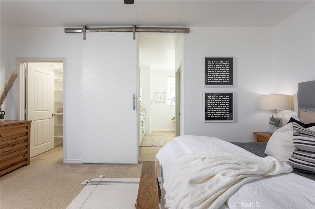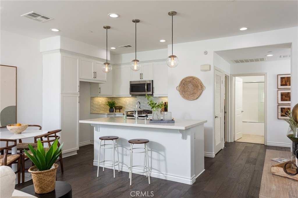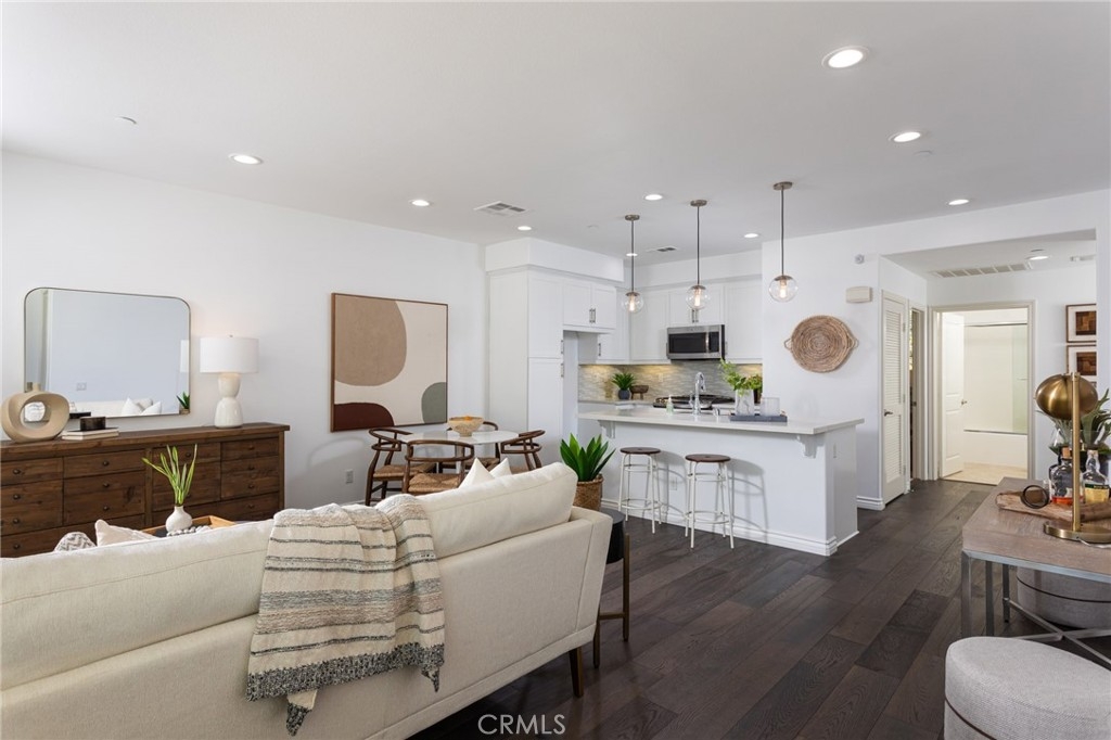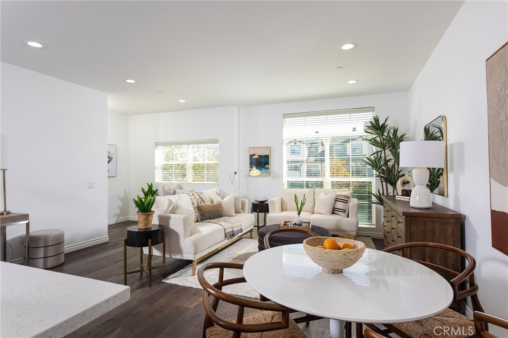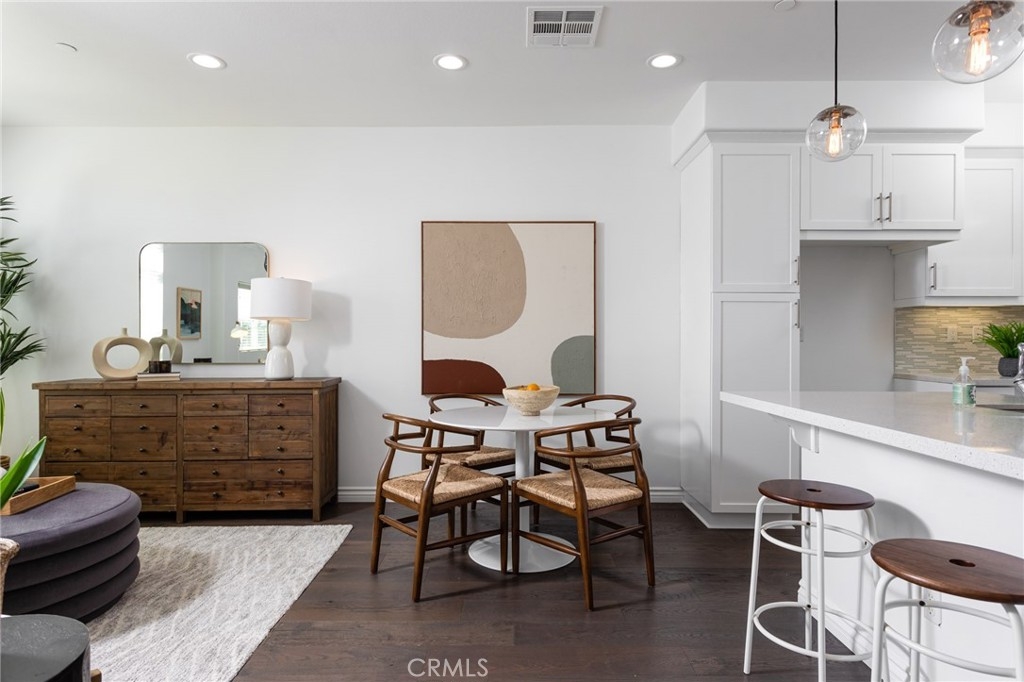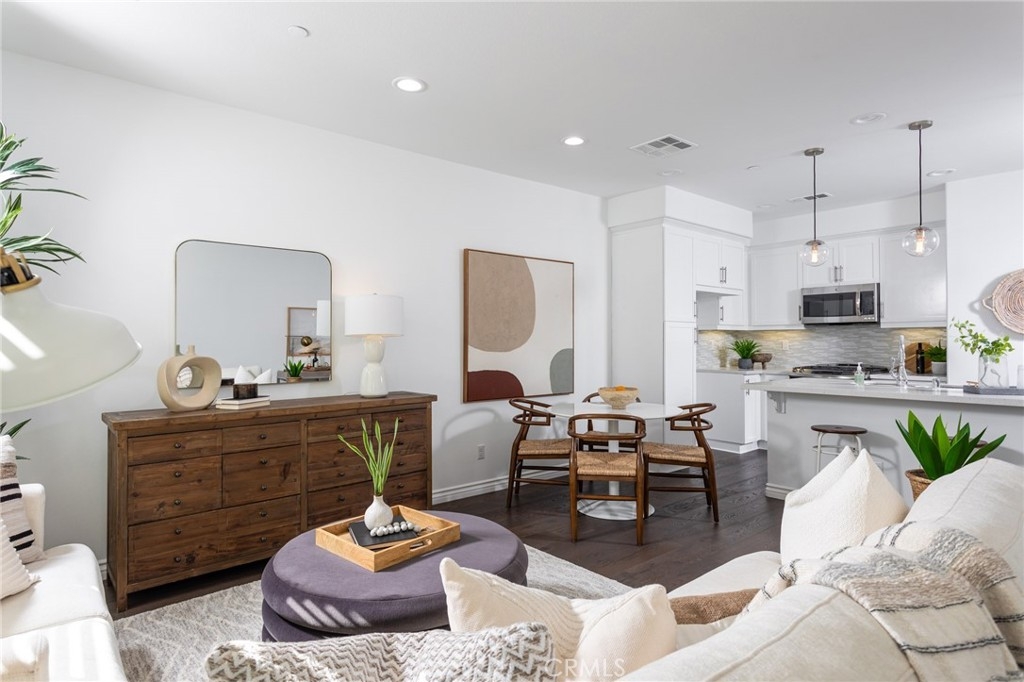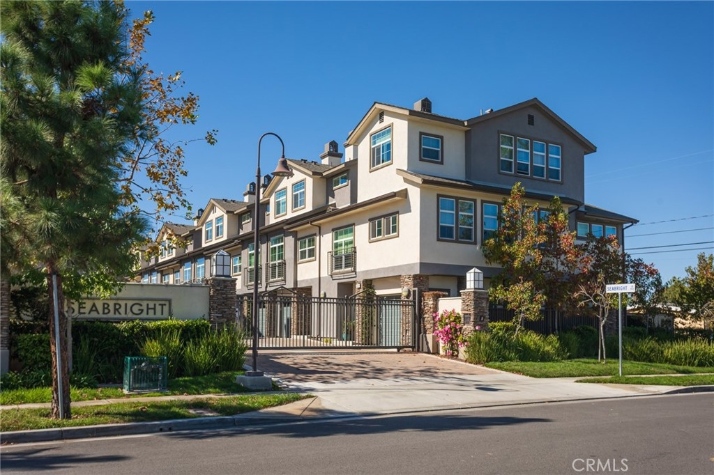It looks like a model home because it was a model home! Former model, contemporary townhome in the gated Seabright community of Costa Mesa. Open concept living & dining areas. Expansive kitchen features custom Caesarstone Quartz slab center island w/ built-in sink, stainless steel appliances and custom backsplash. Lavish Master Suite. 9 foot ceilings & custom hardwood floors throughout the entire home. 2-car attached tandem garage with direct access to the home and private backyard perfect for entertaining & relaxing outdoors.. The soaring 9 foot ceilings and custom hardwood floors throughout add to the spacious modern vibe of this light and bright home. You enter the home through the foyer/office which offers a separate powder room located just off of the private patio. Second level is kitchen and living area with full bath and 2nd bedroom. The sophisticated design offers an entire upper level of master suite with custom sliding barn door, huge walk in closet which has been finished with custom built-ins, an en-suite, spa like bathroom with large custom vanity, double sinks, soaking tub, & separate shower and private patio with mountain views creating a perfect private retreat. Seabright community features pool, sundeck, outdoor shower, & green areas. Families will appreciate the highly ranked Newport Mesa School District. This is a turnkey, light and bright home in a fantastic gated community with low HOA’s, private backyard, walking to shops & restaurants, biking to the beach.