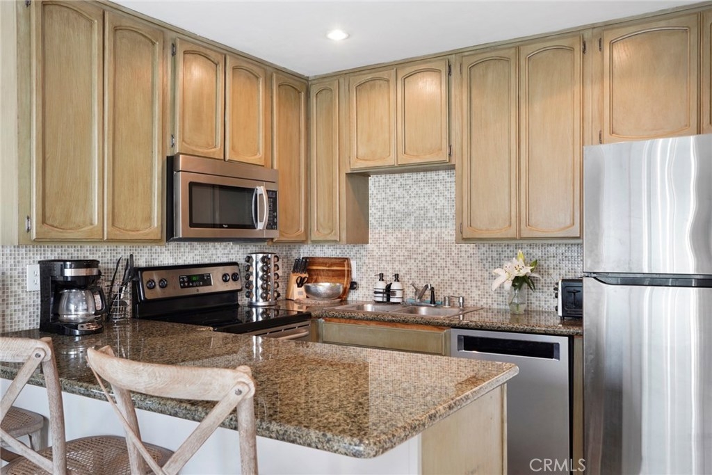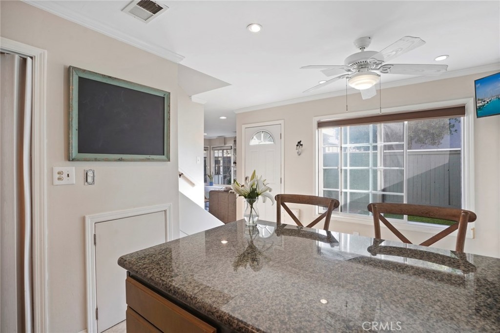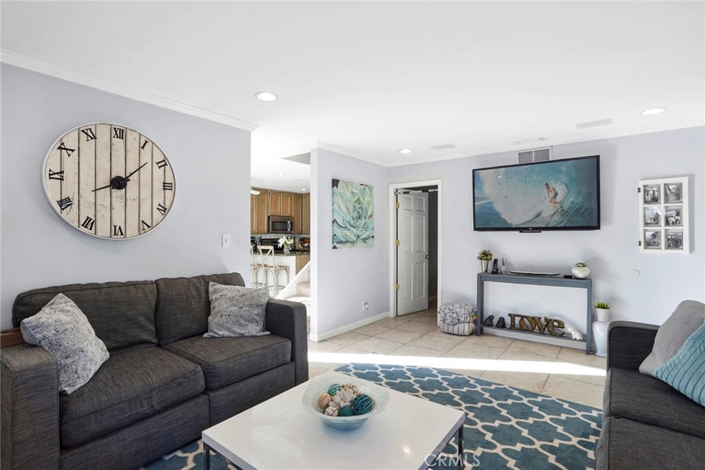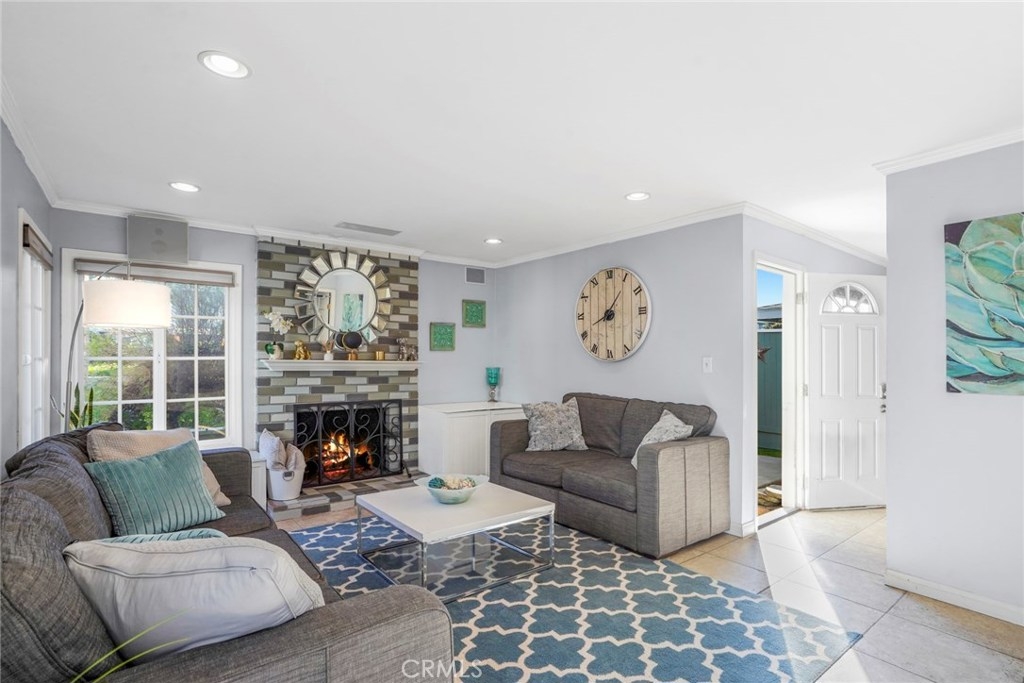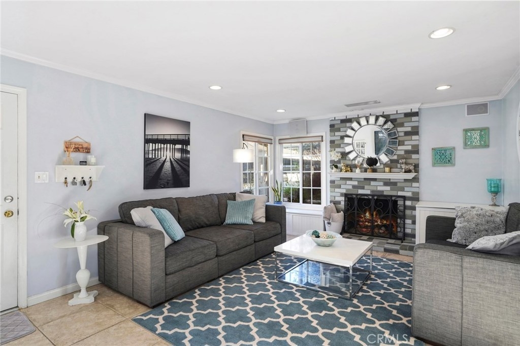 Experience coastal living in this beautiful townhouse! This bright unit features a living room fireplace, dual pane windows, and neutral tile throughout the lower level. The property is complimented with crown moulding, recessed lighting, and built-in media speakers. The kitchen is appointed with granite counter tops, mosaic glass tile backsplash, ample wood cabinetry, a large pantry, stainless steel appliances complete with a built in microwave, and breakfast bar. A large window and glass door flood the kitchen with natural lighting and lead you to your large, private back patio. There's a convenient downstairs master bedroom with an ensuite bathroom. Upstairs there are two spacious bedrooms, including one room with a walk in closet and full bathroom. The garage has built in storage shelving and access to the washer and dryer. This home is located close to all that Costa Mesa has to offer such close proximity to the Triangle, moments to 17th St, and is just 2 miles to Newport Beach.