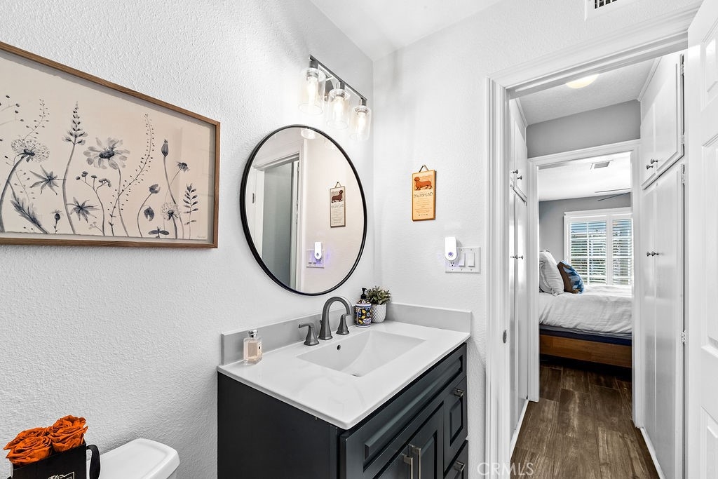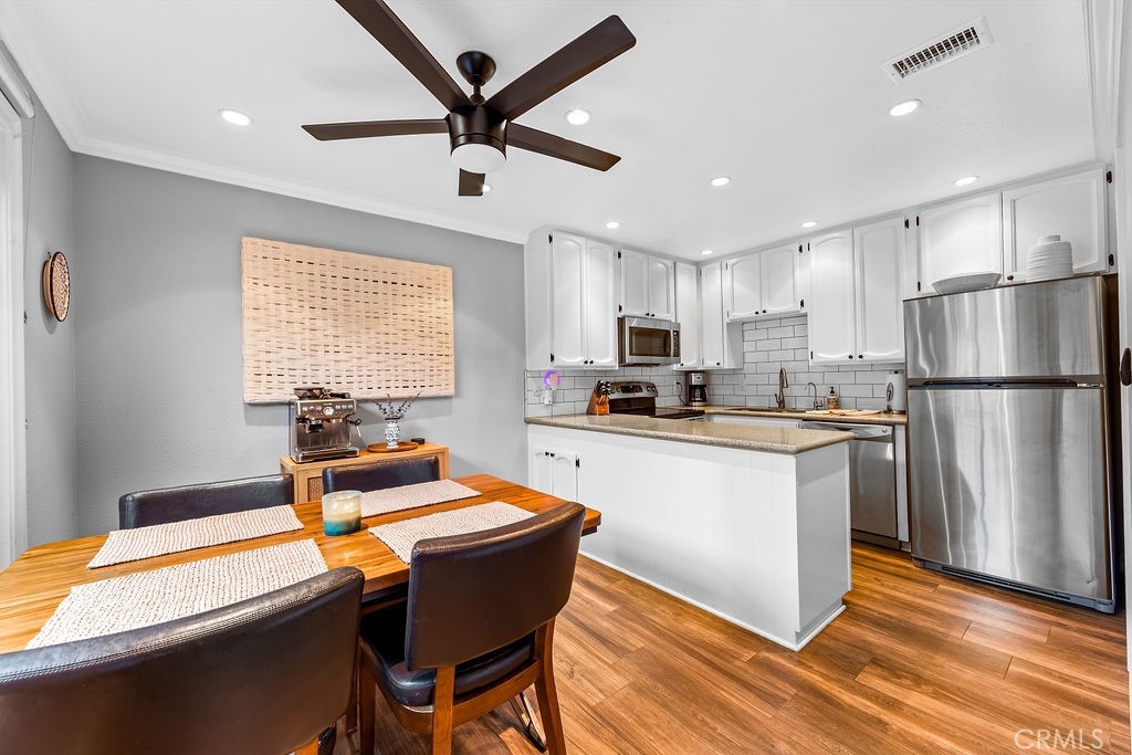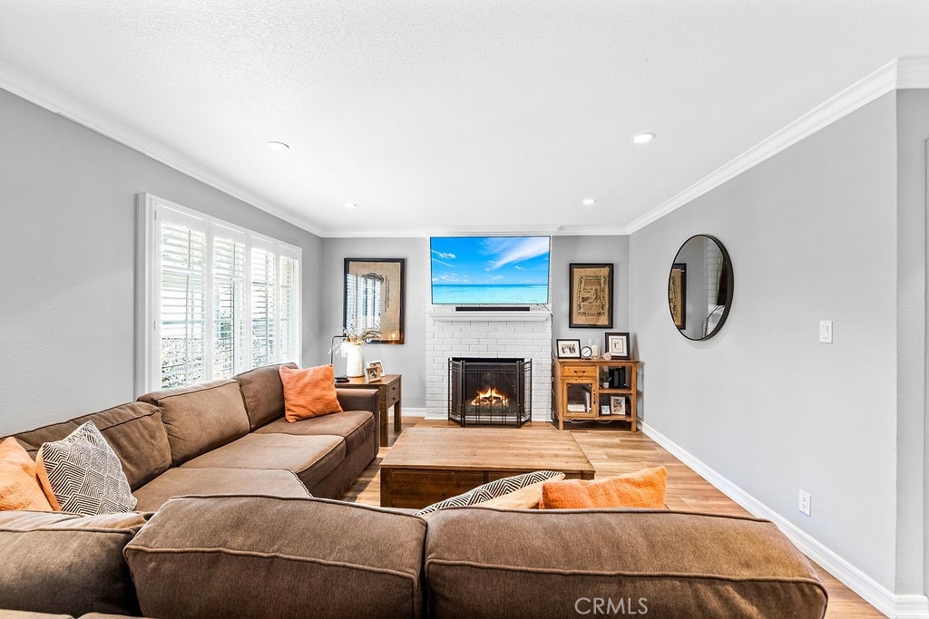 Beautiful Costa Mesa condo features warm color tones, wood plank tile flooring, floor to ceiling brick fireplace, crown molding, vinyl shutters, and recessed lighting. Updated kitchen features ample storage space, granite counters, dual under-mount sink, and subway tile backsplash. Large bedrooms feature carpet flooring and ceiling fans. Bathrooms feature updated vanities and large fully enclosed showers. You'll be sure to stay comfortable year round with the new central air conditioning and furnace. Exterior features include a private patio, end unit, and ample parking with a 1 car attached garage space and 2 additional parking spots in private parking lot. Community features include centralized park-like greenbelt with mature trees, well maintained landscaping, in-ground pool and in-ground wading pool. Located very near Lions Park, beaches, shopping, restaurants, schools, and convenient access to Newport Blvd.