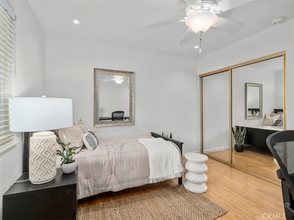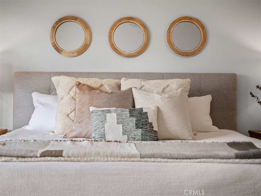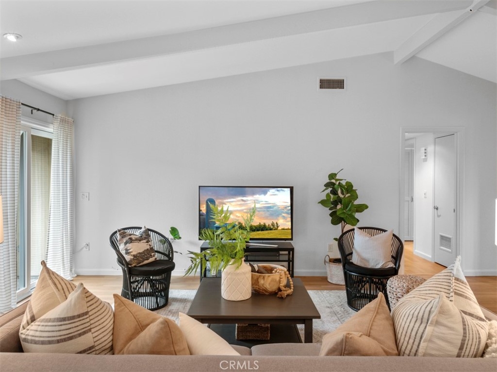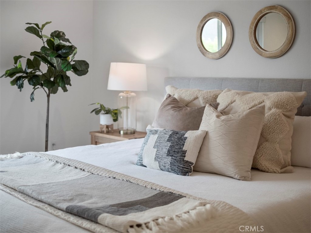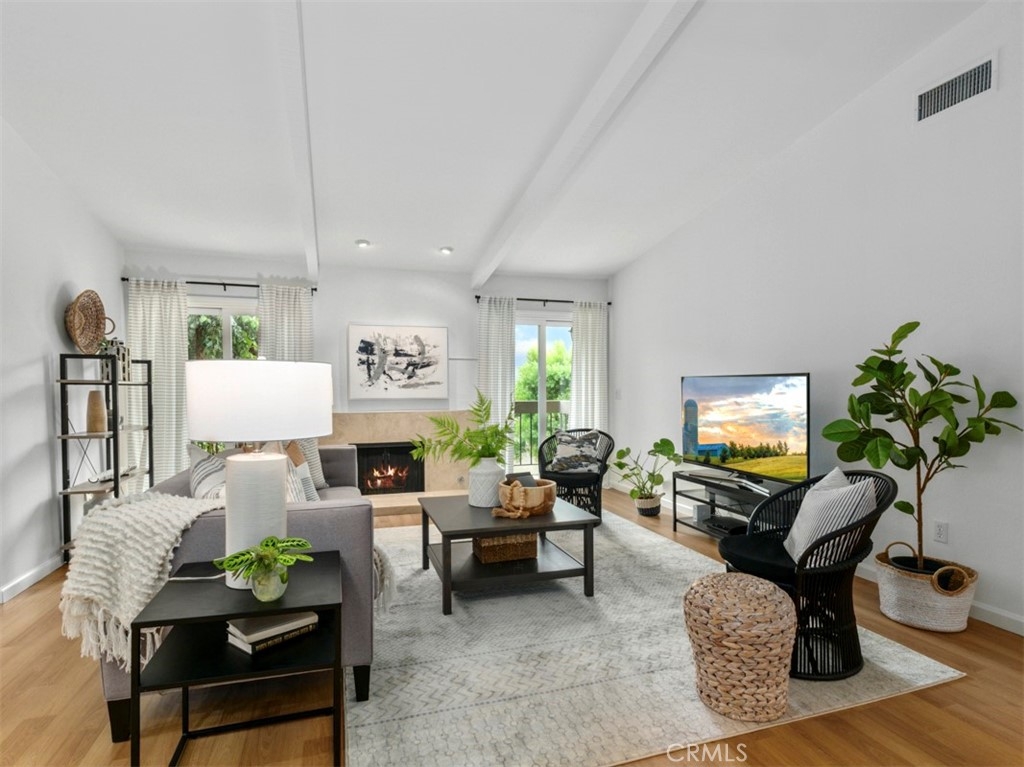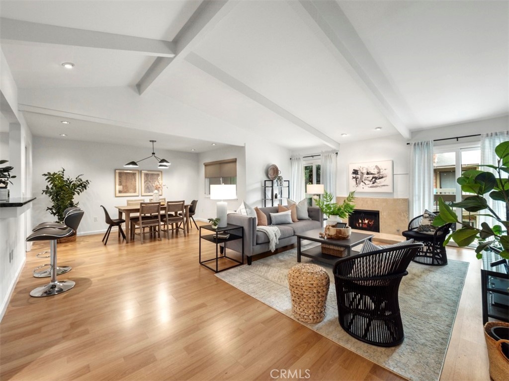 Perched on the second floor, this 1,438 square-foot corner-unit condo resides in the desirable South Coast Metro area of Costa Mesa. Upon entering, the foyer expands into a spacious open living space with captivating vaulted ceilings, wood-like laminate flooring, and an elegant gas fireplace. The interior of the residence is crisp and clean with new paint throughout. An abundance of natural light pours through two sets of sliding glass doors that open to a private balcony. The kitchen features granite countertops, a reverse osmosis drinking faucet, a fast-heating induction/electric stove, soft taupe and white cabinets, a stainless steel refrigerator, and a breakfast bar. A new elegant curvilinear mid-century modern chandelier adorns the cozy dining space. Down the hall is the generously-sized main bedroom with an en-suite bathroom and deep closet. Both bathrooms offer chic black metal-framed mirrors and upgraded vanities. The in-unit laundry area is conveniently located in the hallway with ample amounts of linen closets nearby. Dryer is included. Additional improvements include air conditioning, recessed lighting, ceiling fans, and double-pane windows. Around the corner is the two-car garage with storage cabinets and bike racks. This gated community offers a pool area and recreation room for residents to enjoy. The home is assigned to the coveted Paularino Elementary and Costa Mesa High. Only blocks away from shopping and entertainment at hotspots such as South Coast Plaza, SoCo, and The Camp.