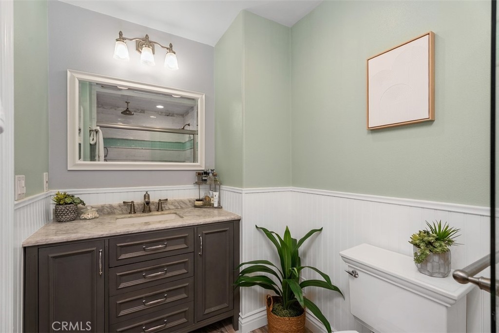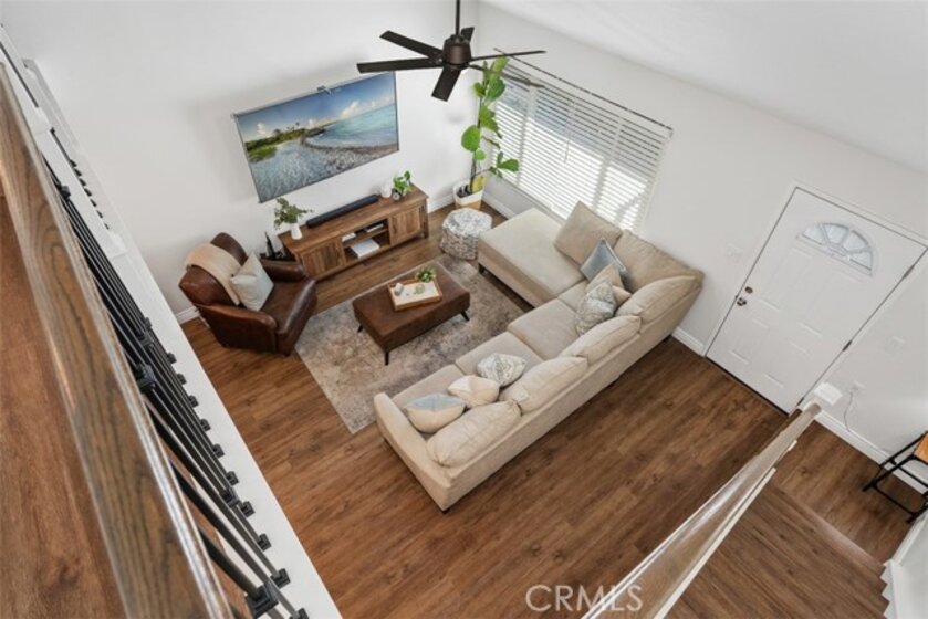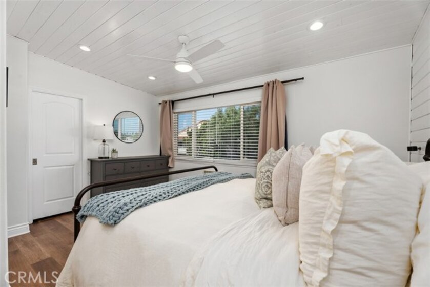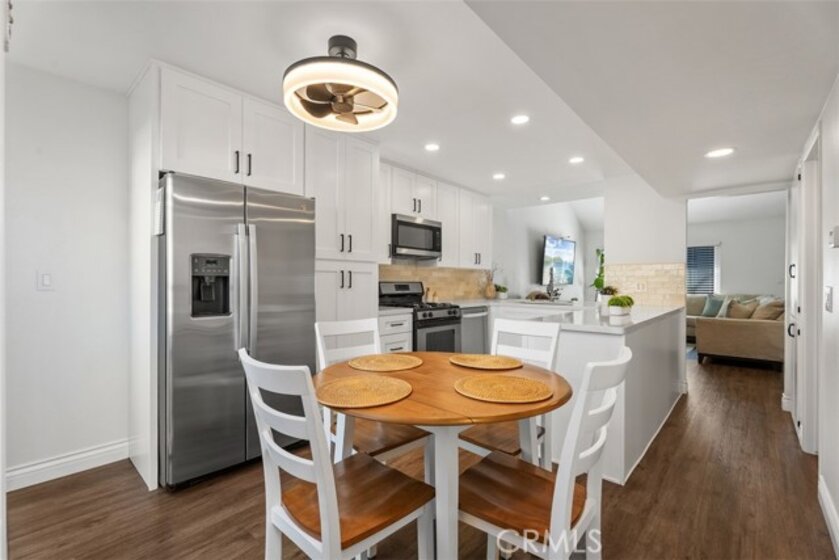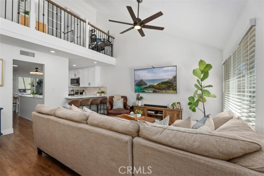 Welcome to a beautifully renovated 2-bedroom, 2-bath home in the desirable Monticello community of Costa Mesa, ideally located at the back of the community offering added privacy and quiet. Recently updated with over $30,000 in improvements, it boasts a fully remodeled and expanded kitchen completed in September 2025 featuring quartz countertops, white soft-close shaker style cabinetry, stainless steel appliances, farm house sink. The kitchen walls have been opened up for a more modern lifestyle including bar seating for four which enhances the flow between the kitchen and living space. The popular layout provides a large main floor bedroom and an upstairs primary suite with an added large walk-in closet and tastefully remodeled bathroom. Additional upgrades include luxury vinyl plank flooring throughout, recessed lighting, ceiling fans, upgraded staircase and railing, dual-pane windows, upgraded electrical outlets and recessed lighting. The primary suite boasts beadboard accent walls and ceiling, built-in AC wall unit, and an upgraded bathroom which includes an oversized shower with subway tile surrounds, dual shower heads, clear glass enclosure, and upgraded vanity. Just outside the french doors of the bedroom is a convenient nook - great for desk space and work from home lifestyle. The main floor bathroom provides a tub/shower combo, large vanity and is adjoining to the dual closets servicing the main floor bedroom. Enjoy a private tiled courtyard, perfect for BBQs and entertaining, plus a charming front yard with new sod and a mature lemon tree. The garage features epoxy flooring, built-in cabinetry, overhead storage, and a LiftMaster MyQ smart garage motor and designated laundry area. Added bonus - the garage opens to an interior street and not other garages allowing for easy access.Take advantage of this rare opportunity to own a move-in ready home in Monticello Community. Homeowners enjoy the community pool and clubhouse, as well as discounted pricing to OC Fair Grounds for all residents and short distance to the local dog park, conveniently located near freeways including the 405, 73 and 55, and beaches in Newport Beach, world renowned shopping and more! Live close to it all!