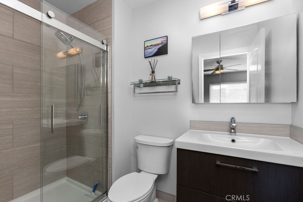 This stylish home offers an open-concept layout designed for modern living, featuring durable wood laminate flooring with a driftwood-inspired finish, wide baseboards, smooth ceilings, and upgraded interior doors and windows. A sleek travertine-faced gas fireplace adds warmth to the space, while a designer-inspired color palette enhances the contemporary feel. Nestled in a private and ideal location with no unit behind it, this home offers a rare level of privacy.The kitchen is both functional and elegant, boasting quartz countertops, a spacious breakfast bar, and custom wood cabinetry with soft-close doors. High-end stainless steel appliances, including a counter-depth refrigerator, complement the space, along with custom lighting and premium fixtures. A private balcony, accessible through sliding doors, extends the living area outdoors.The guest bathroom showcases a refined design with a Carrera-topped wood vanity and framed mirror. Upstairs, two generously sized bedrooms each feature their own ensuite bathrooms, thoughtfully updated with modern tile flooring, newly tiled tubs and showers with built-in shampoo niches, frameless glass doors, and solid surface vanities. Plush carpeting, ceiling fans, and wood blinds enhance the comfort of the bedrooms.Additional highlights include a one-car garage, additional outdoor storage, private laundry, and prime location in the community. This home is conveniently close to the beach, shopping along 17th Street, and the vibrant Triangle Square district.