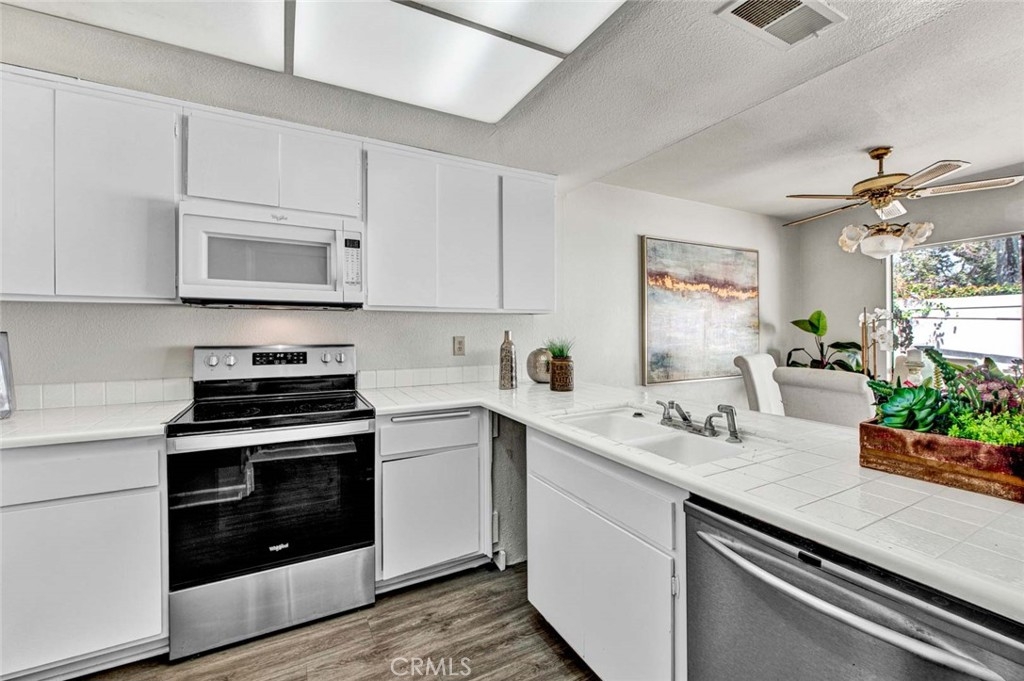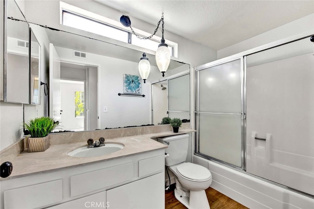 Welcome to this charming 3-bedroom, 2-bathroom condo in the Village Creek community of Costa Mesa. Spanning 1,324 square feet, this home greets you with fresh paint and laminate flooring as you enter. The first level features a main-level bedroom, ideal for guests or a home office. The kitchen, equipped with stainless steel appliances, flows seamlessly into the dining room, which opens to your private patio through sliding glass doors. The living room includes high ceilings and a cozy fireplace. Upstairs, you’ll find two additional bedrooms with newly laid lush carpeting. The two-car garage provides direct access to the home and includes washer and dryer hook-ups. Enjoy the community amenities, including a pool, clubhouse, picturesque pathways, a charming gazebo, and tranquil brooks. This prime location offers easy access to South Coast Plaza, Metro Pointe, South Coast Village and John Wayne Airport, providing endless entertainment and dining options. Don’t miss your chance to become the newest neighbor in this wonderful community!