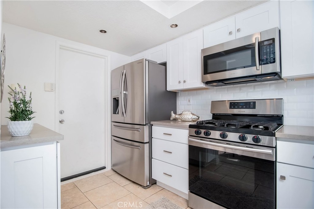 Located in a gated community just under three miles to the beach, this remodeled townhome boasts smart design, a clean color palette, and a spacious floor plan with vaulted ceilings. The downstairs statement window welcomes heaps of natural light creating an airy open space. The remodeled kitchen features white shaker style cabinets, quartz countertops, single bowl sink, full tile backsplash, and stainless steel appliances. Beautiful tile floors stretch throughout the first floor and wood laminate through the second floor. There is a gas fireplace in the living room and peek around the fireplace to find a large storage area. Walking through the sliding glass doors, you will find a large patio and yard with artificial grass. Upstairs you will find two spacious master bedrooms with vaulted ceilings, and each with their own full bathrooms. The home also has an oversized two car garage with direct access to the kitchen, dual pane windows throughout, recently painted interior, newer furnace, and Central A/C. The roof is approximately two years old. San Michel is a quiet gated community offering a pool, spa, and BBQ area with a low $239/month HOA. This is a must see.