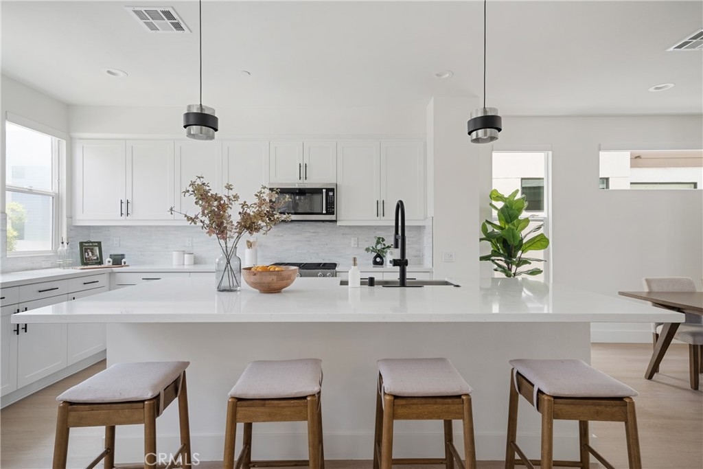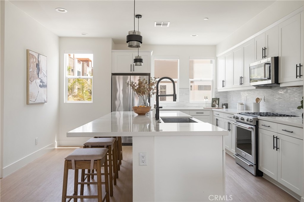 Enjoy 360-degree panoramic views from the rooftop! Step into elevated coastal living at 17 West, a stunning END UNIT tri-level residence that exemplifies contemporary elegance and timeless design. Perfectly positioned just over a mile from the sparkling shores of Newport Beach, this turkey home was built in 2019 and has been meticulously maintained to model-home standards. Offering approximately 2,057 square feet of thoughtfully designed living space, the residence features 3 spacious bedrooms, 4 luxurious bathrooms, and a versatile first-floor office or den—easily adaptable as a fourth bedroom to suit your lifestyle needs. The main living level is an airy, light-filled haven, showcasing warm oak flooring and a seamless open-concept layout. Anchoring the space is a sophisticated chef’s kitchen, highlighted by an oversized stone island, premium smart appliances, and classic white cabinetry—all designed with both function and refinement in mind. A walk-in pantry provides abundant storage while preserving clean, modern lines throughout. Upstairs, the primary suite serves as a serene escape, complete with a custom walk-in closet and a spa-inspired ensuite bath featuring dual vanities, refined finishes, and a frameless glass shower. The crowning jewel of this home is the expansive private rooftop deck—an entertainer’s dream and a personal retreat in one. Framed by captivating city light views, this open-air sanctuary is ideal for sunset gatherings, intimate evenings by the fire pit, or simply enjoying the coastal breeze under the stars. Additional highlights include close access to guest parking, close proximity to Pacific Coast Highway, premier shopping and dining, top-rated schools, and John Wayne Airport—bringing all the best right to your doorstep.